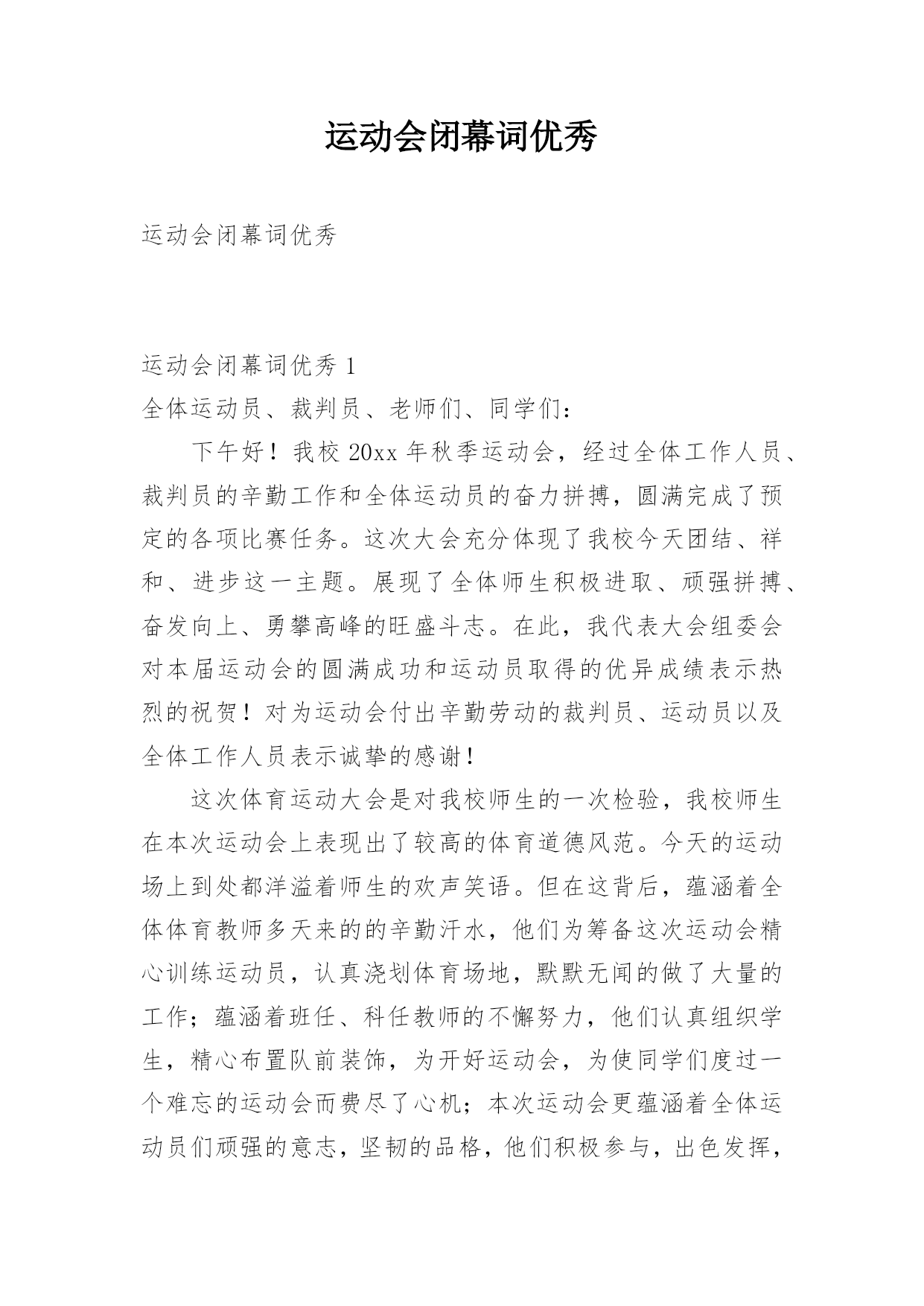 运动会闭幕词优秀运动会闭幕词优秀运动会闭幕词优秀1全体运动员、裁判员、老师们、同学们:下午好!我校20xx年秋季运动会,经过全体工作人员、裁判员的辛勤工作和全体运动员的奋力拼搏,圆满完成了预定的各项比赛任务。这次大会充分体现了我校今天团结、祥和、进步这一主题。展现了全体师生积极进取、顽强拼搏、奋发向上、勇攀高峰的旺盛斗志。在此,我代表大会组委会对本届运动会的圆满成功和运动员取得的优异成绩表示热烈的祝贺!对为运动会付出辛勤劳动的裁判员、运动员以及全体工作人员表示诚挚的感谢!这次体育运动大会是对我校师生的一次