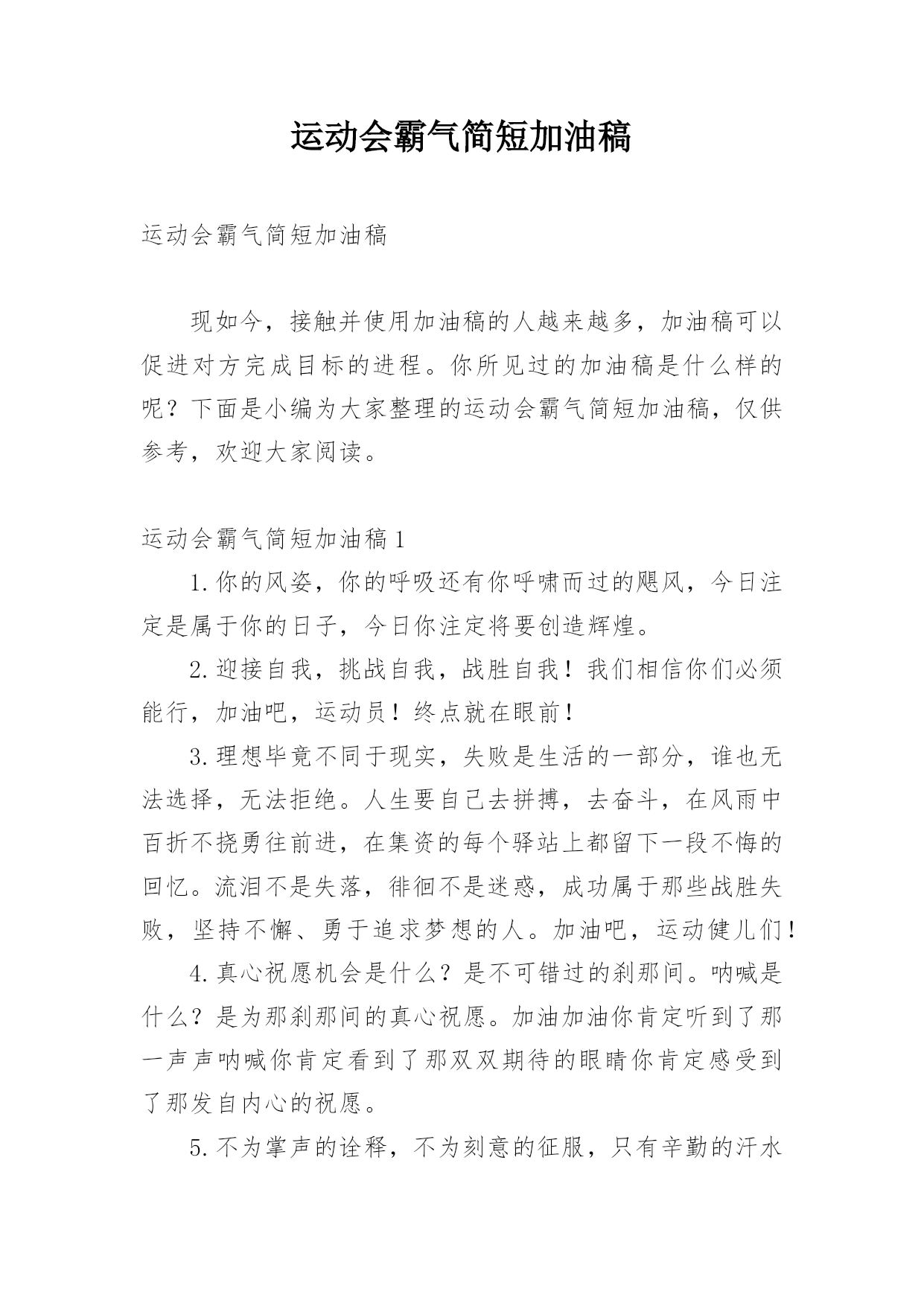 运动会霸气简短加油稿运动会霸气简短加油稿现如今,接触并使用加油稿的人越来越多,加油稿可以促进对方完成目标的进程。你所见过的加油稿是什么样的呢?下面是小编为大家整理的运动会霸气简短加油稿,仅供参考,欢迎大家阅读。运动会霸气简短加油稿11.你的风姿,你的呼吸还有你呼啸而过的飓风,今日注定是属于你的日子,今日你注定将要创造辉煌。2.迎接自我,挑战自我,战胜自我!我们相信你们必须能行,加油吧,运动员!终点就在眼前!3.理想毕竟不同于现实,失败是生活的一部分,谁也无法选择,无法拒绝。人生要自己去拼搏,去奋斗,在风雨