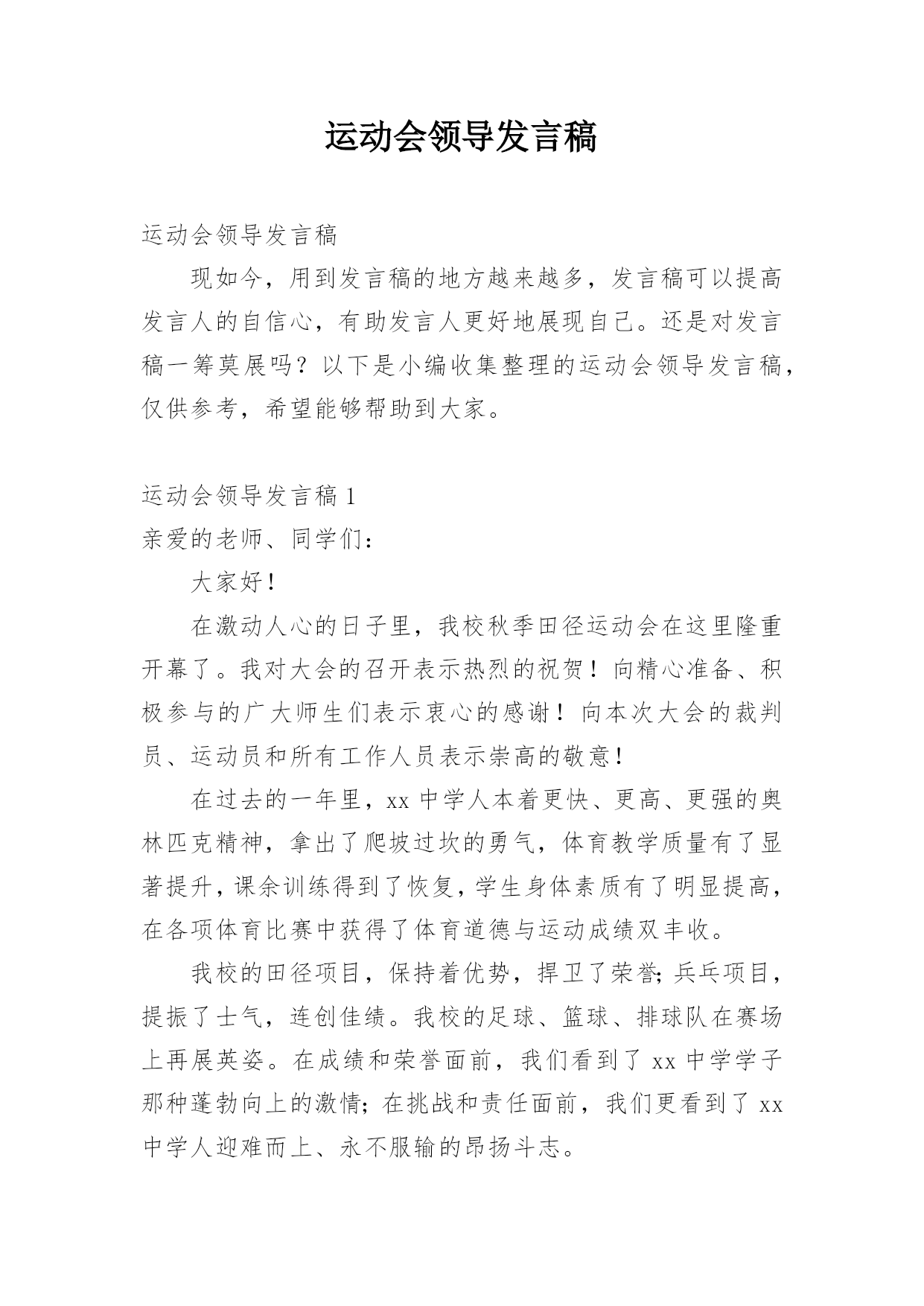 运动会领导发言稿运动会领导发言稿现如今,用到发言稿的地方越来越多,发言稿可以提高发言人的自信心,有助发言人更好地展现自己。还是对发言稿一筹莫展吗?以下是小编收集整理的运动会领导发言稿,仅供参考,希望能够帮助到大家。运动会领导发言稿1亲爱的老师、同学们:大家好!在激动人心的日子里,我校秋季田径运动会在这里隆重开幕了。我对大会的召开表示热烈的祝贺!向精心准备、积极参与的广大师生们表示衷心的感谢!向本次大会的裁判员、运动员和所有工作人员表示崇高的敬意!在过去的一年里,xx中学人本着更快、更高、更强的奥林匹克精神