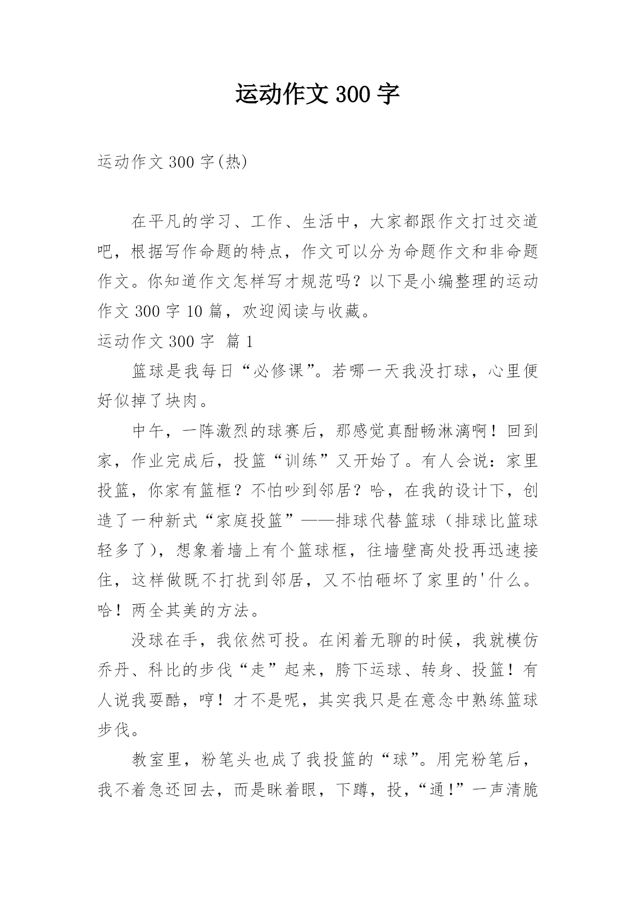运动作文300字运动作文300字(热)在平凡的学习、工作、生活中,大家都跟作文打过交道吧,根据写作命题的特点,作文可以分为命题作文和非命题作文。你知道作文怎样写才规范吗?以下是小编整理的运动作文300字10篇,欢迎阅读与收藏。运动作文300字篇1篮球是我每日“必修课”。若哪一天我没打球,心里便好似掉了块肉。中午,一阵激烈的球赛后,那感觉真酣畅淋漓啊!回到家,作业完成后,投篮“训练”又开始了。有人会说:家里投篮,你家有篮框?不怕吵到邻居?哈,在我的设计下,创造了一种新式“家庭投篮”——排球代替篮球(排球比篮