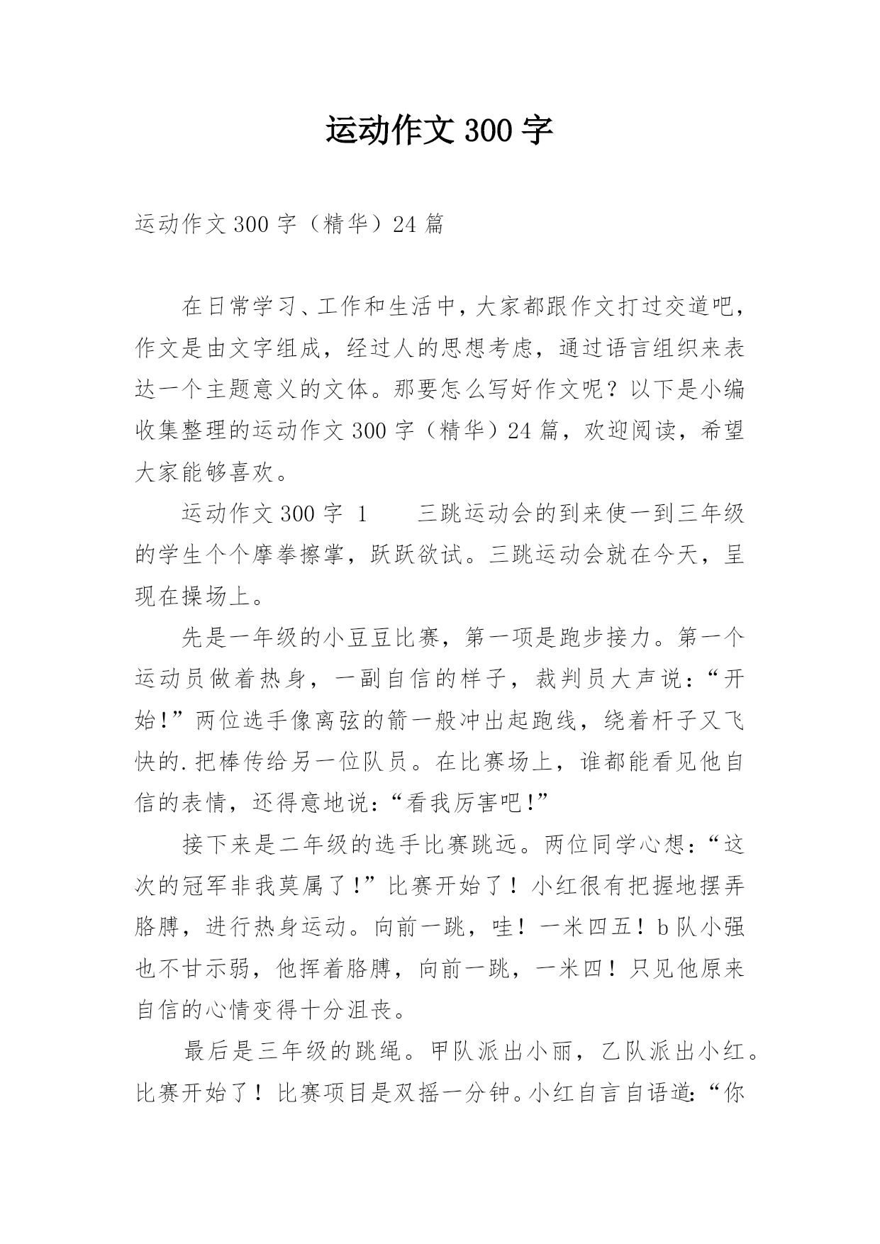 运动作文300字运动作文300字(精华)24篇在日常学习、工作和生活中,大家都跟作文打过交道吧,作文是由文字组成,经过人的思想考虑,通过语言组织来表达一个主题意义的文体。那要怎么写好作文呢?以下是小编收集整理的运动作文300字(精华)24篇,欢迎阅读,希望大家能够喜欢。运动作文300字1三跳运动会的到来使一到三年级的学生个个摩拳擦掌,跃跃欲试。三跳运动会就在今天,呈现在操场上。先是一年级的小豆豆比赛,第一项是跑步接力。第一个运动员做着热身,一副自信的样子,裁判员大声说:“开始!”两位选手像离弦的箭一般冲出