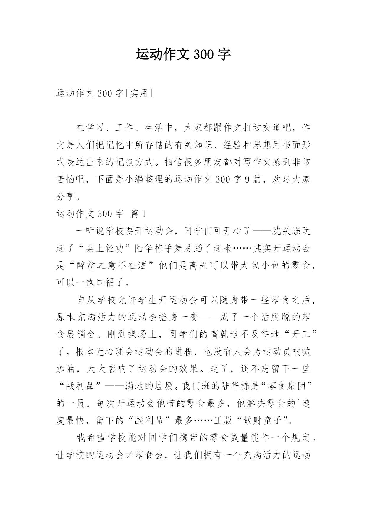 运动作文300字运动作文300字[实用]在学习、工作、生活中,大家都跟作文打过交道吧,作文是人们把记忆中所存储的有关知识、经验和思想用书面形式表达出来的记叙方式。相信很多朋友都对写作文感到非常苦恼吧,下面是小编整理的运动作文300字9篇,欢迎大家分享。运动作文300字篇1一听说学校要开运动会,同学们可开心了——沈关强玩起了“桌上轻功”陆华栋手舞足蹈了起来……其实开运动会是“醉翁之意不在酒”他们是高兴可以带大包小包的零食,可以一饱口福了。自从学校允许学生开运动会可以随身带一些零食之后,原本充满活力的运动会摇
