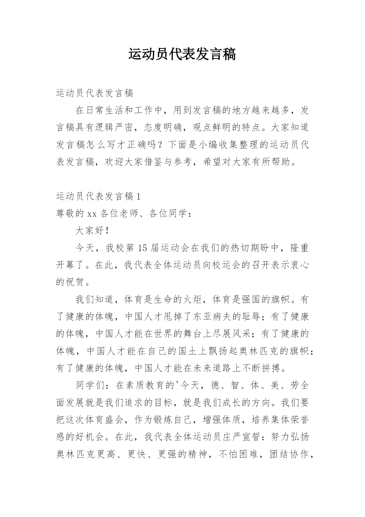 运动员代表发言稿运动员代表发言稿在日常生活和工作中,用到发言稿的地方越来越多,发言稿具有逻辑严密,态度明确,观点鲜明的特点。大家知道发言稿怎么写才正确吗?下面是小编收集整理的运动员代表发言稿,欢迎大家借鉴与参考,希望对大家有所帮助。运动员代表发言稿1尊敬的xx各位老师、各位同学:大家好!今天,我校第15届运动会在我们的热切期盼中,隆重开幕了。在此,我代表全体运动员向校运会的召开表示衷心的祝贺。我们知道,体育是生命的火炬,体育是强国的旗帜。有了健康的体魄,中国人才甩掉了东亚病夫的耻辱;有了健康的体魄,中国人