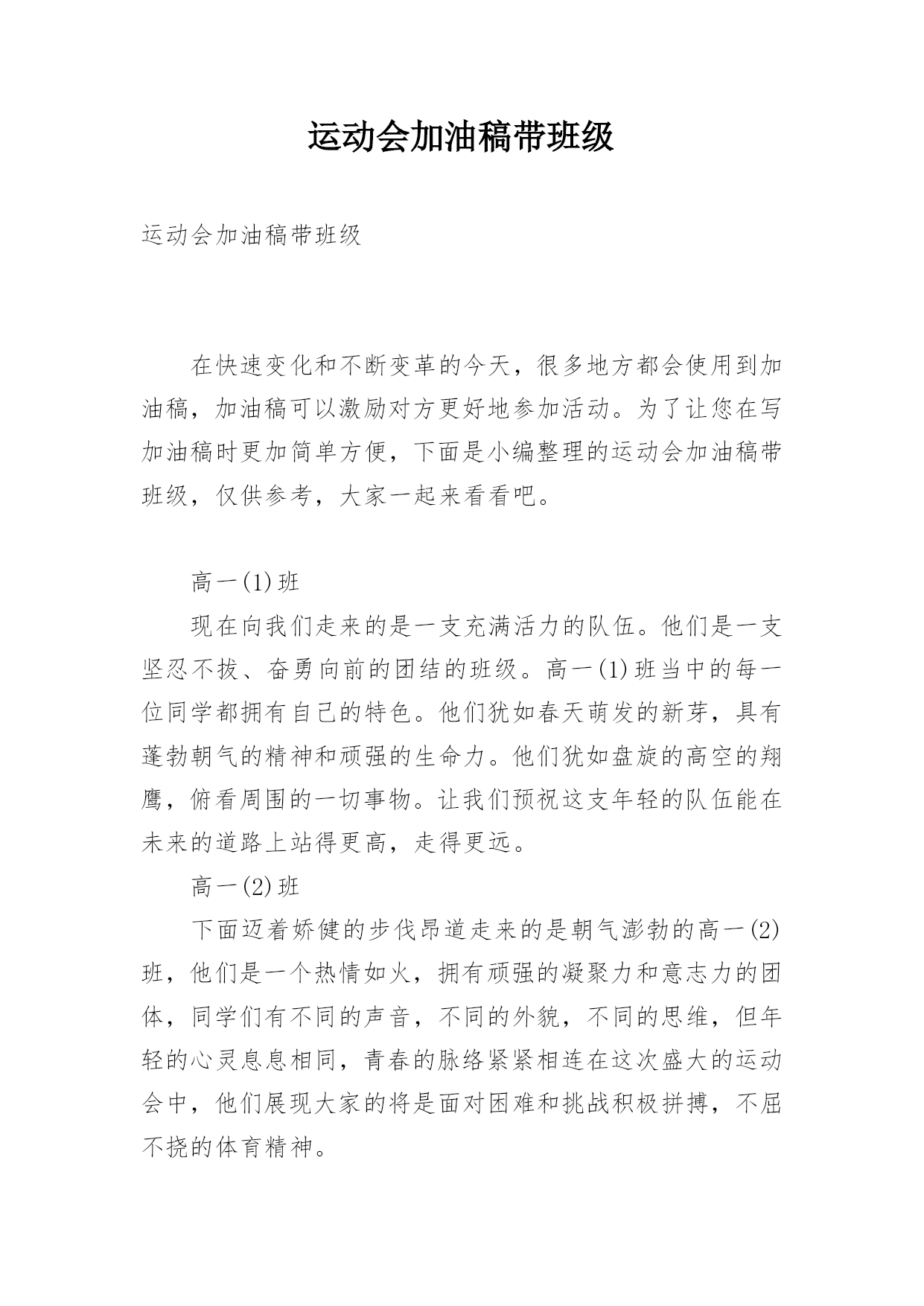 运动会加油稿带班级运动会加油稿带班级在快速变化和不断变革的今天,很多地方都会使用到加油稿,加油稿可以激励对方更好地参加活动。为了让您在写加油稿时更加简单方便,下面是小编整理的运动会加油稿带班级,仅供参考,大家一起来看看吧。高一(1)班现在向我们走来的是一支充满活力的队伍。他们是一支坚忍不拔、奋勇向前的团结的班级。高一(1)班当中的每一位同学都拥有自己的特色。他们犹如春天萌发的新芽,具有蓬勃朝气的精神和顽强的生命力。他们犹如盘旋的高空的翔鹰,俯看周围的一切事物。让我们预祝这支年轻的队伍能在未来的道路上站得更