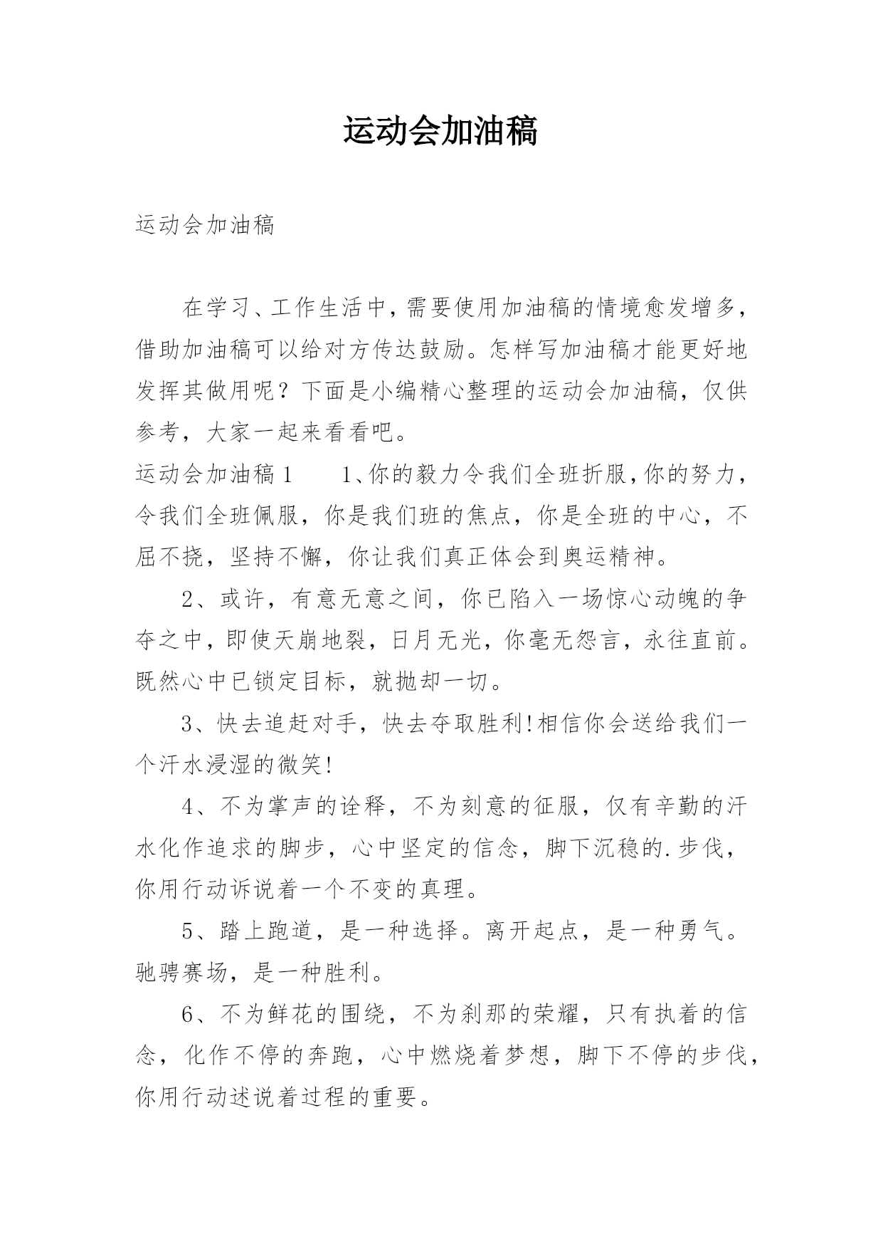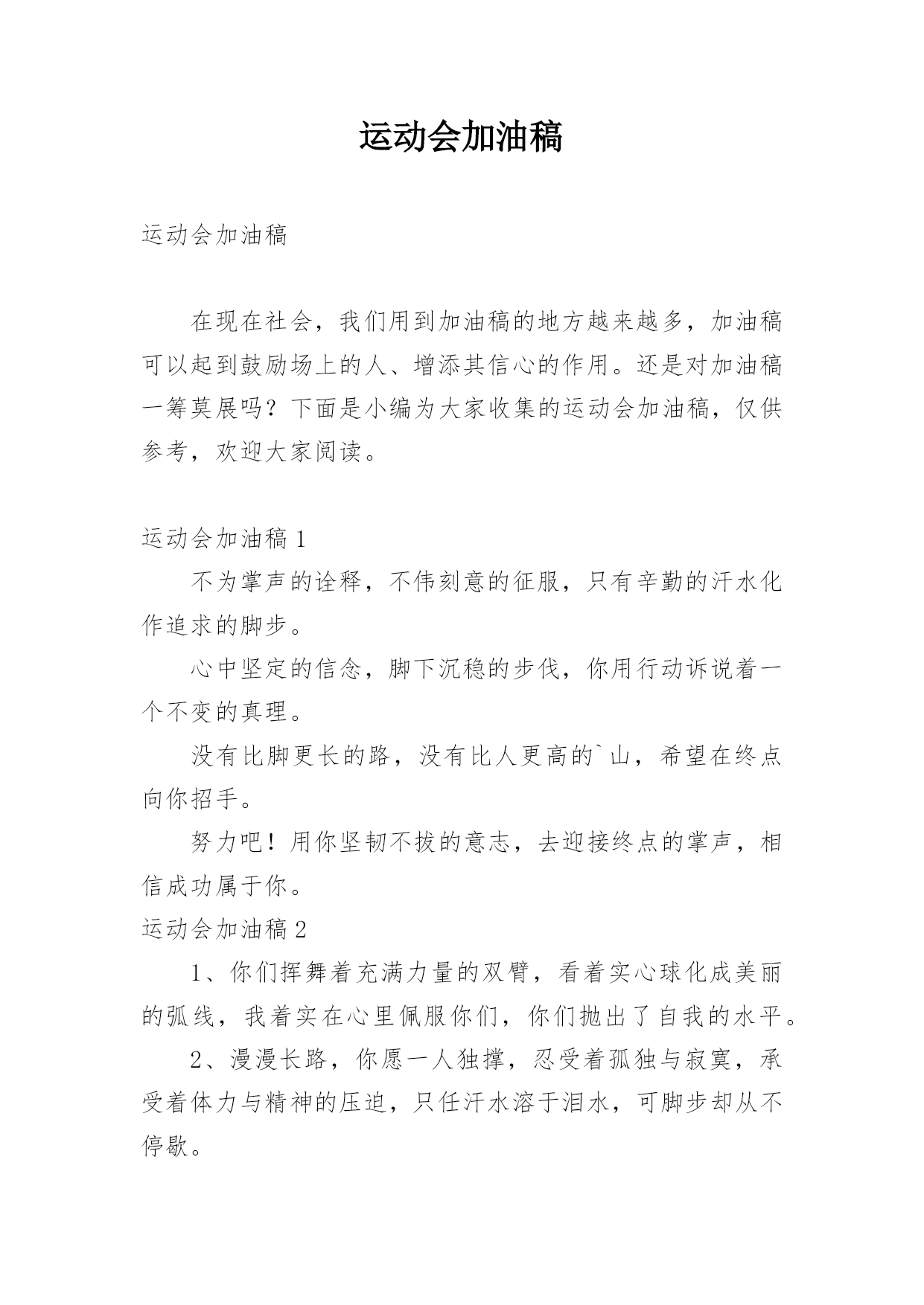 运动会加油稿运动会加油稿在现在社会,我们用到加油稿的地方越来越多,加油稿可以起到鼓励场上的人、增添其信心的作用。还是对加油稿一筹莫展吗?下面是小编为大家收集的运动会加油稿,仅供参考,欢迎大家阅读。运动会加油稿1不为掌声的诠释,不伟刻意的征服,只有辛勤的汗水化作追求的脚步。心中坚定的信念,脚下沉稳的步伐,你用行动诉说着一个不变的真理。没有比脚更长的路,没有比人更高的`山,希望在终点向你招手。努力吧!用你坚韧不拔的意志,去迎接终点的掌声,相信成功属于你。运动会加油稿21、你们挥舞着充满力量的双臂,看着实心球化