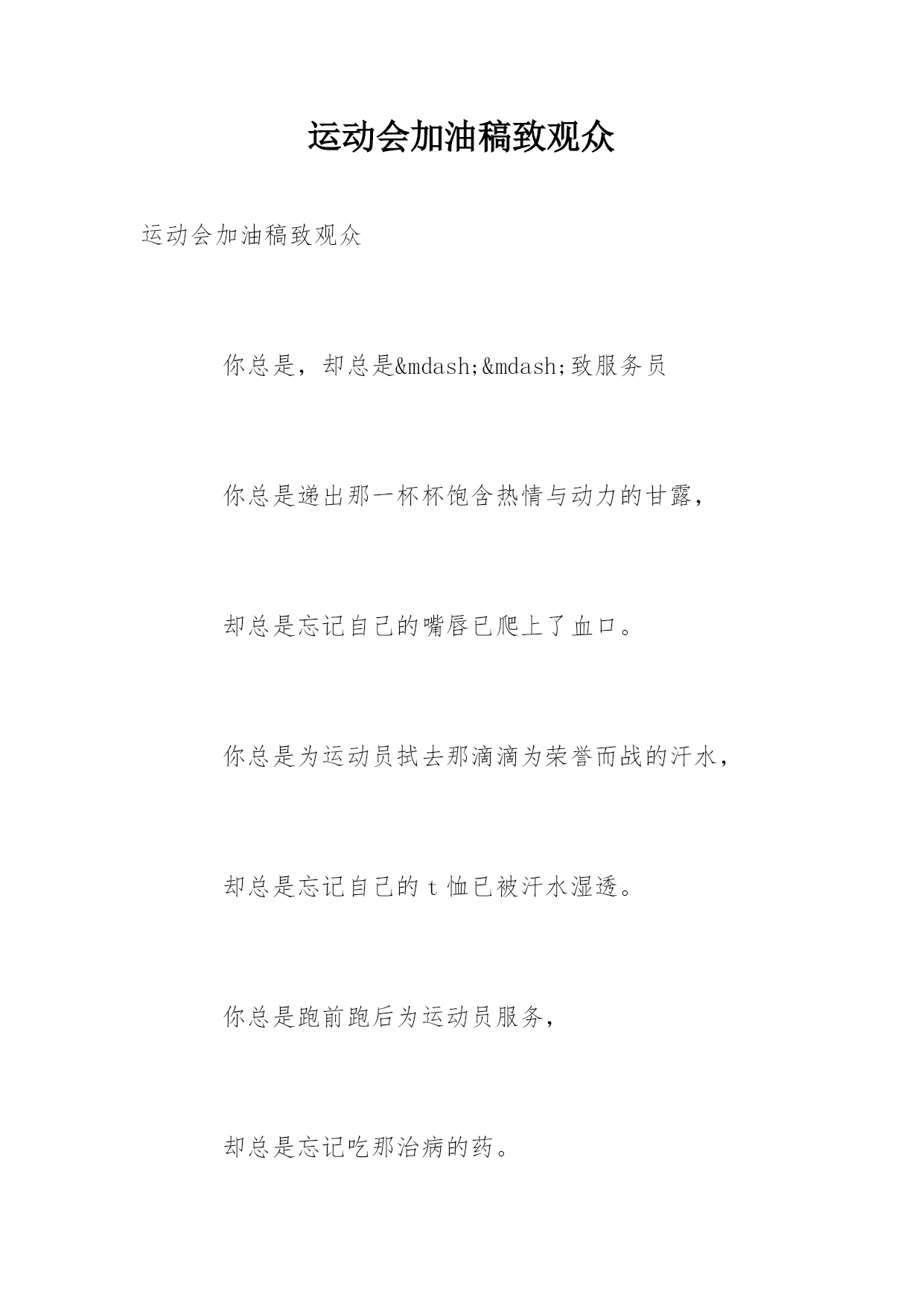 运动会加油稿致观众运动会加油稿致观众你总是,却总是——致服务员你总是递出那一杯杯饱含热情与动力的甘露,却总是忘记自己的嘴唇已爬上了血口。你总是为运动员拭去那滴滴为荣誉而战的汗水,却总是忘记自己的t恤已被汗水湿透。你总是跑前跑后为运动员服务,却总是忘记吃那治病的药。你总是……却总是……瞬间当发令枪响起的那一瞬间;当铅球在手中即将掷出的那一瞬间;当跨杆从你的腿下静止的那一瞬间;当沙坑就要等你去征服的那一瞬间;时间停止,空气凝固,每
