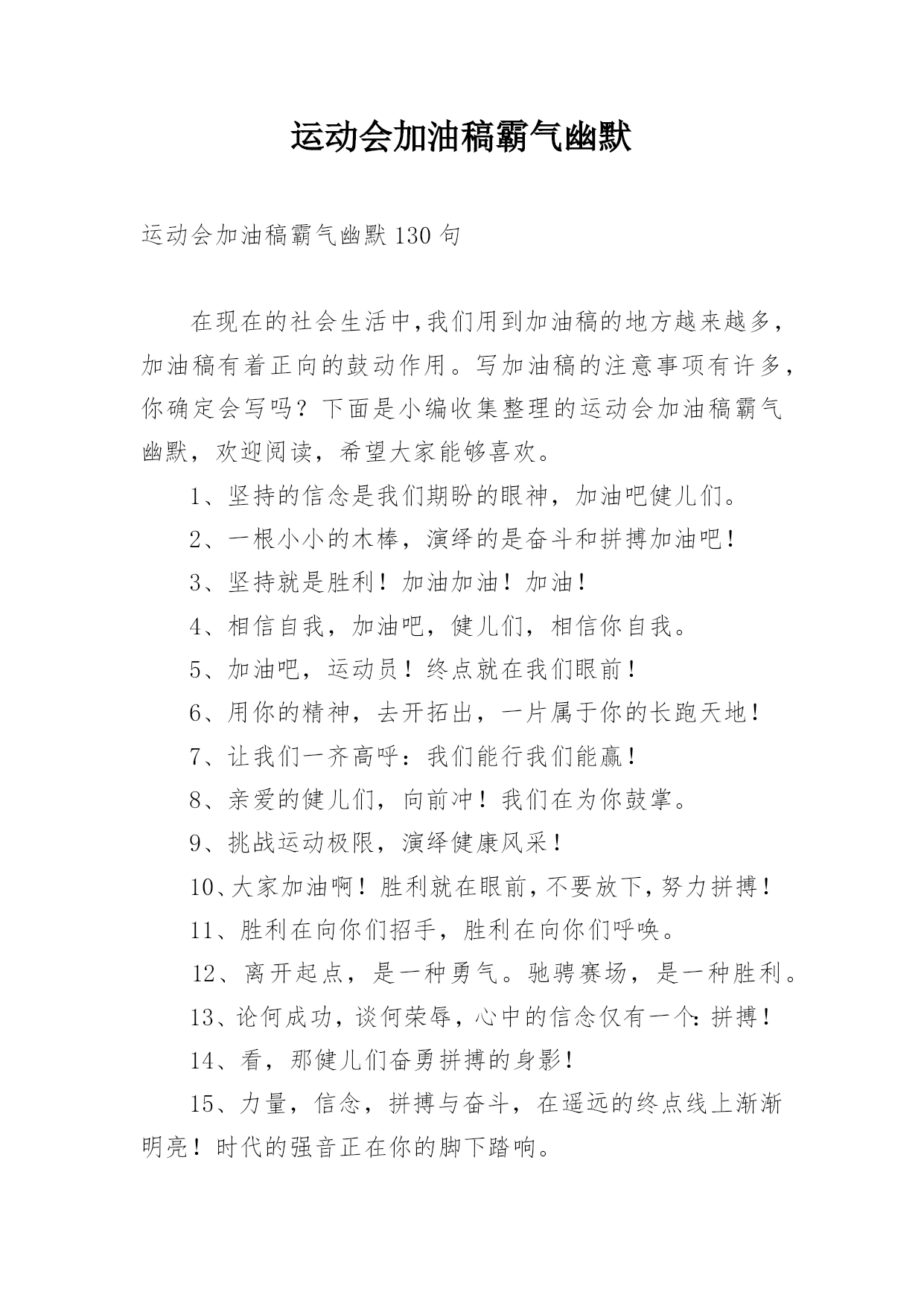 运动会加油稿霸气幽默运动会加油稿霸气幽默130句在现在的社会生活中,我们用到加油稿的地方越来越多,加油稿有着正向的鼓动作用。写加油稿的注意事项有许多,你确定会写吗?下面是小编收集整理的运动会加油稿霸气幽默,欢迎阅读,希望大家能够喜欢。1、坚持的信念是我们期盼的眼神,加油吧健儿们。2、一根小小的木棒,演绎的是奋斗和拼搏加油吧!3、坚持就是胜利!加油加油!加油!4、相信自我,加油吧,健儿们,相信你自我。5、加油吧,运动员!终点就在我们眼前!6、用你的精神,去开拓出,一片属于你的长跑天地!7、让我们一齐高呼:我