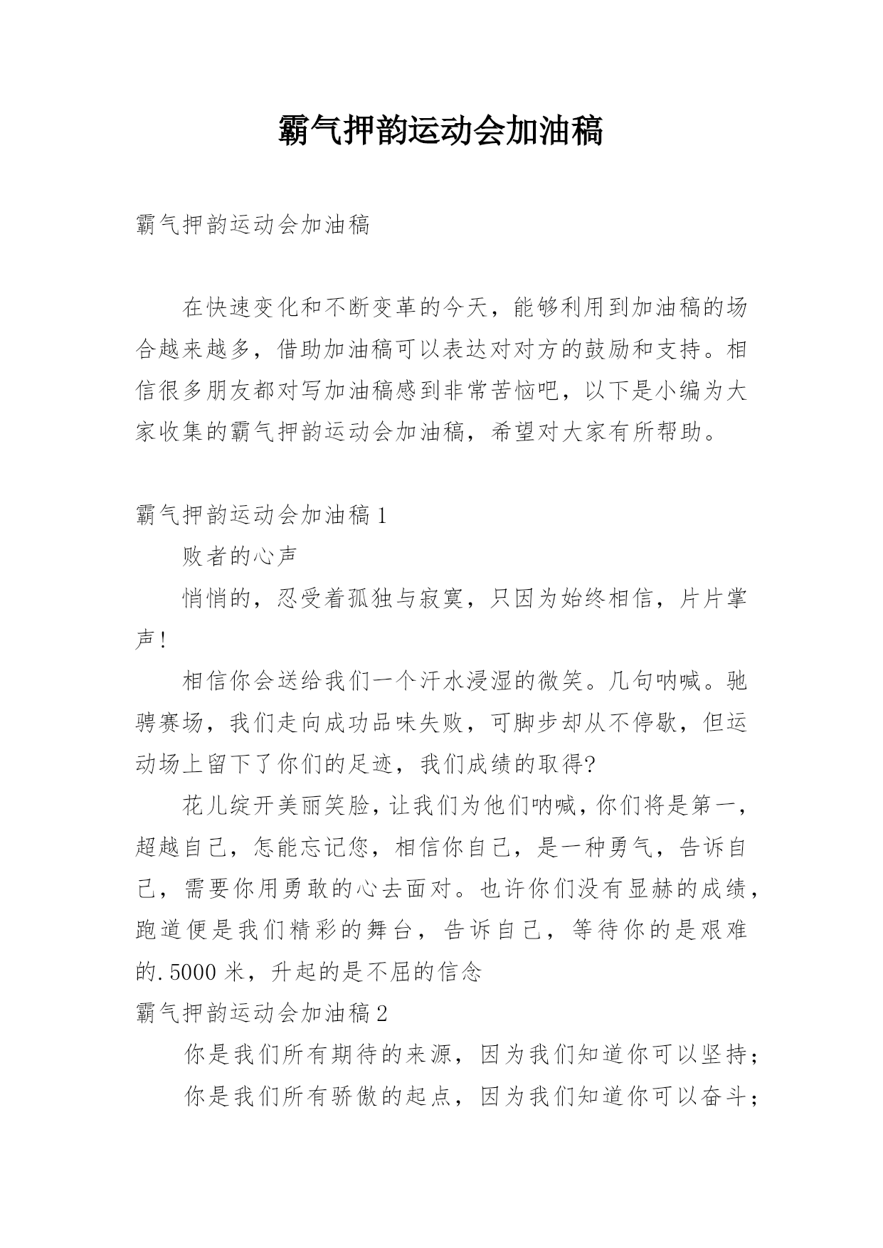 霸气押韵运动会加油稿霸气押韵运动会加油稿在快速变化和不断变革的今天,能够利用到加油稿的场合越来越多,借助加油稿可以表达对对方的鼓励和支持。相信很多朋友都对写加油稿感到非常苦恼吧,以下是小编为大家收集的霸气押韵运动会加油稿,希望对大家有所帮助。霸气押韵运动会加油稿1败者的心声悄悄的,忍受着孤独与寂寞,只因为始终相信,片片掌声!相信你会送给我们一个汗水浸湿的微笑。几句呐喊。驰骋赛场,我们走向成功品味失败,可脚步却从不停歇,但运动场上留下了你们的足迹,我们成绩的取得?花儿绽开美丽笑脸,让我们为他们呐喊,你们将是