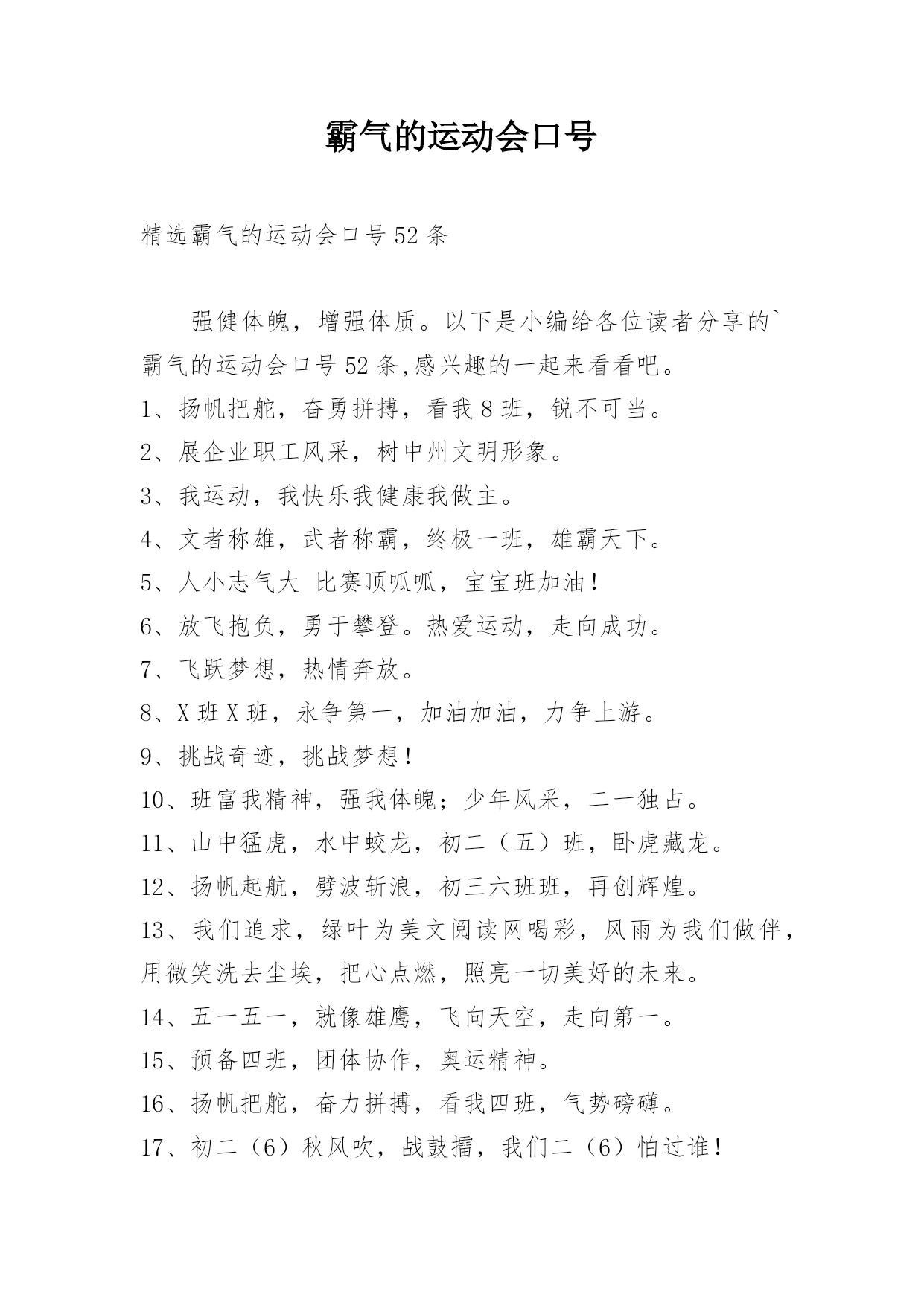 霸气的运动会口号精选霸气的运动会口号52条强健体魄,增强体质。以下是小编给各位读者分享的`霸气的运动会口号52条,感兴趣的一起来看看吧。1、扬帆把舵,奋勇拼搏,看我8班,锐不可当。2、展企业职工风采,树中州文明形象。3、我运动,我快乐我健康我做主。4、文者称雄,武者称霸,终极一班,雄霸天下。5、人小志气大比赛顶呱呱,宝宝班加油!6、放飞抱负,勇于攀登。热爱运动,走向成功。7、飞跃梦想,热情奔放。8、X班X班,永争第一,加油加油,力争上游。9、挑战奇迹,挑战梦想!10、班富我精神,强我体魄;少年风采,二一独
