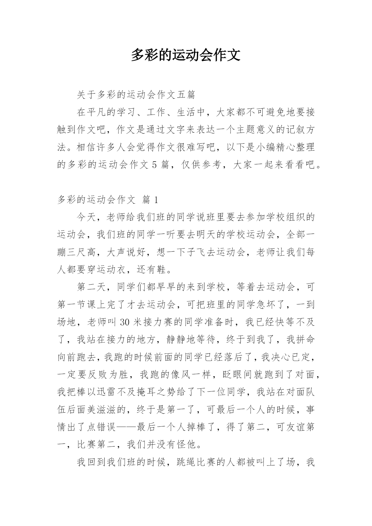 多彩的运动会作文关于多彩的运动会作文五篇在平凡的学习、工作、生活中,大家都不可避免地要接触到作文吧,作文是通过文字来表达一个主题意义的记叙方法。相信许多人会觉得作文很难写吧,以下是小编精心整理的多彩的运动会作文5篇,仅供参考,大家一起来看看吧。多彩的运动会作文篇1今天,老师给我们班的同学说班里要去参加学校组织的运动会,我们班的同学一听要去明天的学校运动会,全部一蹦三尺高,大声说好,想一下子飞去运动会,老师让我们每人都要穿运动衣,还有鞋。第二天,同学们都早早的来到学校,等着去运动会,可第一节课上完了才去运动