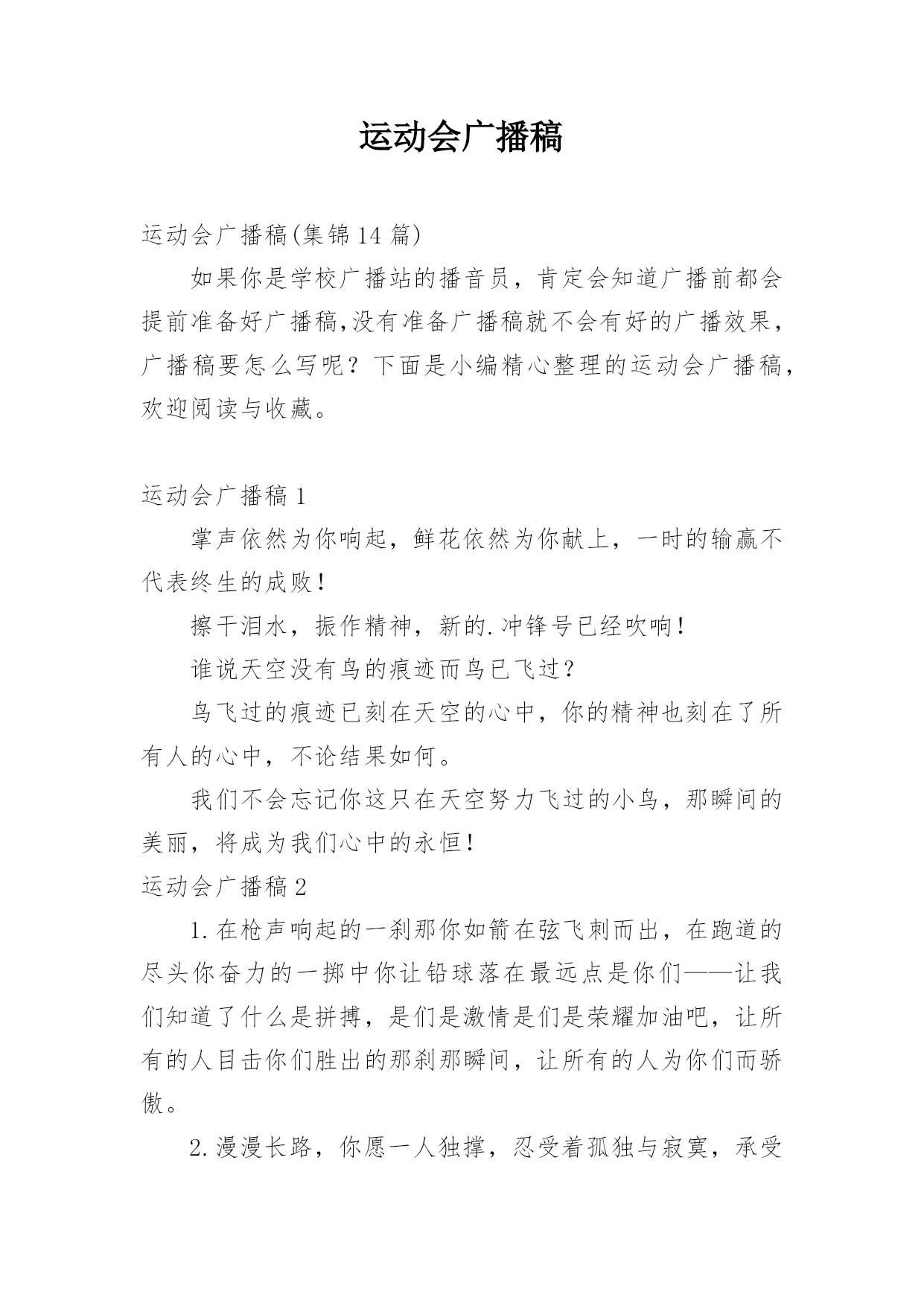 运动会广播稿运动会广播稿(集锦14篇)如果你是学校广播站的播音员,肯定会知道广播前都会提前准备好广播稿,没有准备广播稿就不会有好的广播效果,广播稿要怎么写呢?下面是小编精心整理的运动会广播稿,欢迎阅读与收藏。运动会广播稿1掌声依然为你响起,鲜花依然为你献上,一时的输赢不代表终生的成败!擦干泪水,振作精神,新的.冲锋号已经吹响!谁说天空没有鸟的痕迹而鸟已飞过?鸟飞过的痕迹已刻在天空的心中,你的精神也刻在了所有人的心中,不论结果如何。我们不会忘记你这只在天空努力飞过的小鸟,那瞬间的美丽,将成为我们心中的永恒!