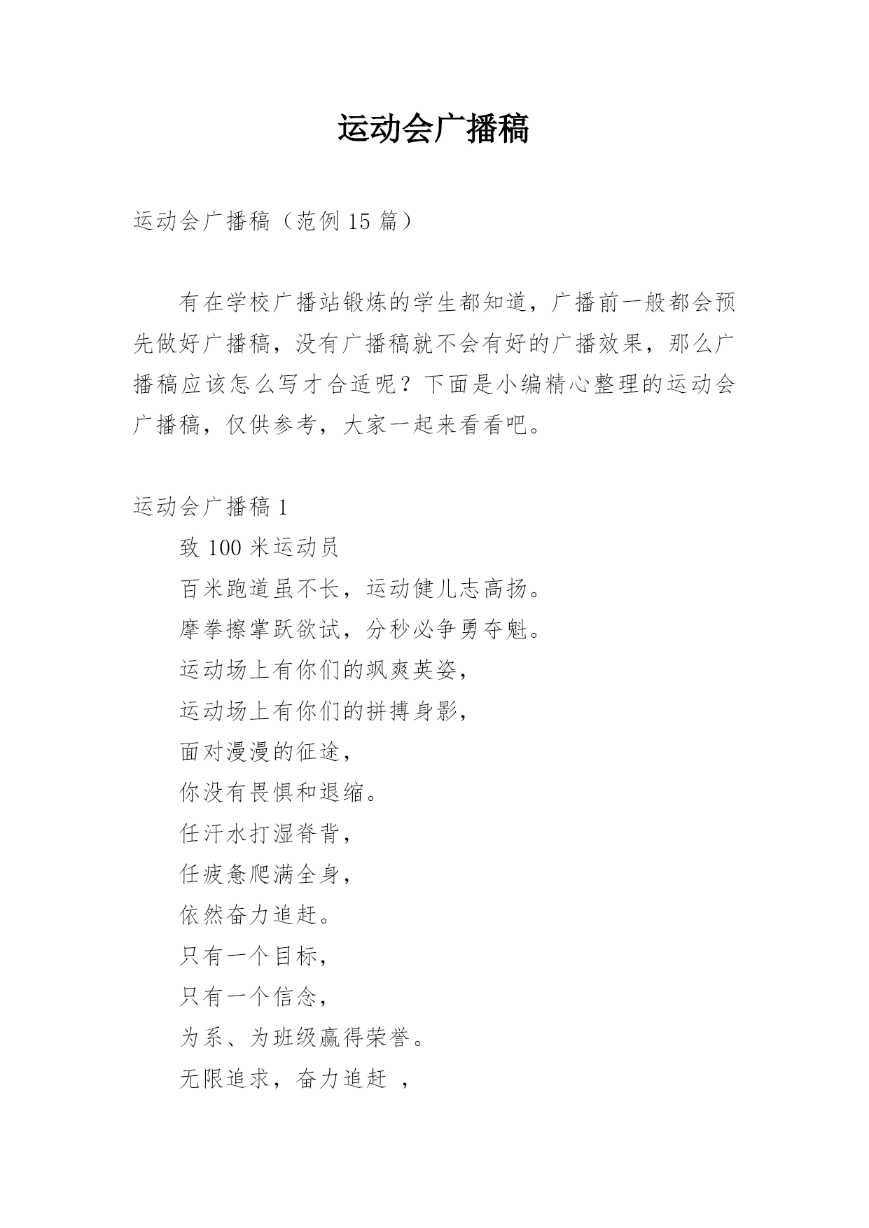 运动会广播稿运动会广播稿(范例15篇)有在学校广播站锻炼的学生都知道,广播前一般都会预先做好广播稿,没有广播稿就不会有好的广播效果,那么广播稿应该怎么写才合适呢?下面是小编精心整理的运动会广播稿,仅供参考,大家一起来看看吧。运动会广播稿1致100米运动员百米跑道虽不长,运动健儿志高扬。摩拳擦掌跃欲试,分秒必争勇夺魁。运动场上有你们的飒爽英姿,运动场上有你们的拼搏身影,面对漫漫的征途,你没有畏惧和退缩。任汗水打湿脊背,任疲惫爬满全身,依然奋力追赶。只有一个目标,只有一个信念,为系、为班级赢得荣誉。无限追求,