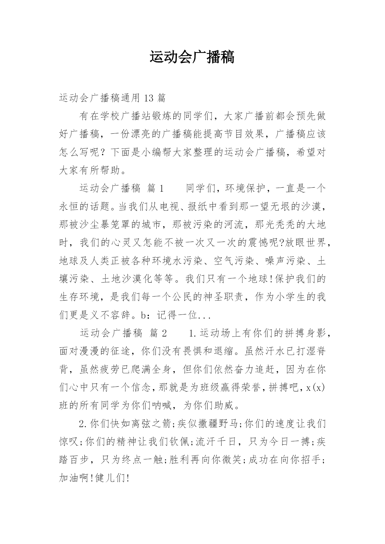 运动会广播稿运动会广播稿通用13篇有在学校广播站锻炼的同学们,大家广播前都会预先做好广播稿,一份漂亮的广播稿能提高节目效果,广播稿应该怎么写呢?下面是小编帮大家整理的运动会广播稿,希望对大家有所帮助。运动会广播稿篇1同学们,环境保护,一直是一个永恒的话题。当我们从电视、报纸中看到那一望无垠的沙漠,那被沙尘暴笼罩的城市,那被污染的河流,那光秃秃的大地时,我们的心灵又怎能不被一次又一次的震憾呢?放眼世界,地球及人类正被各种环境水污染、空气污染、噪声污染、土壤污染、土地沙漠化等等。我们只有一个地球!保护我们的生