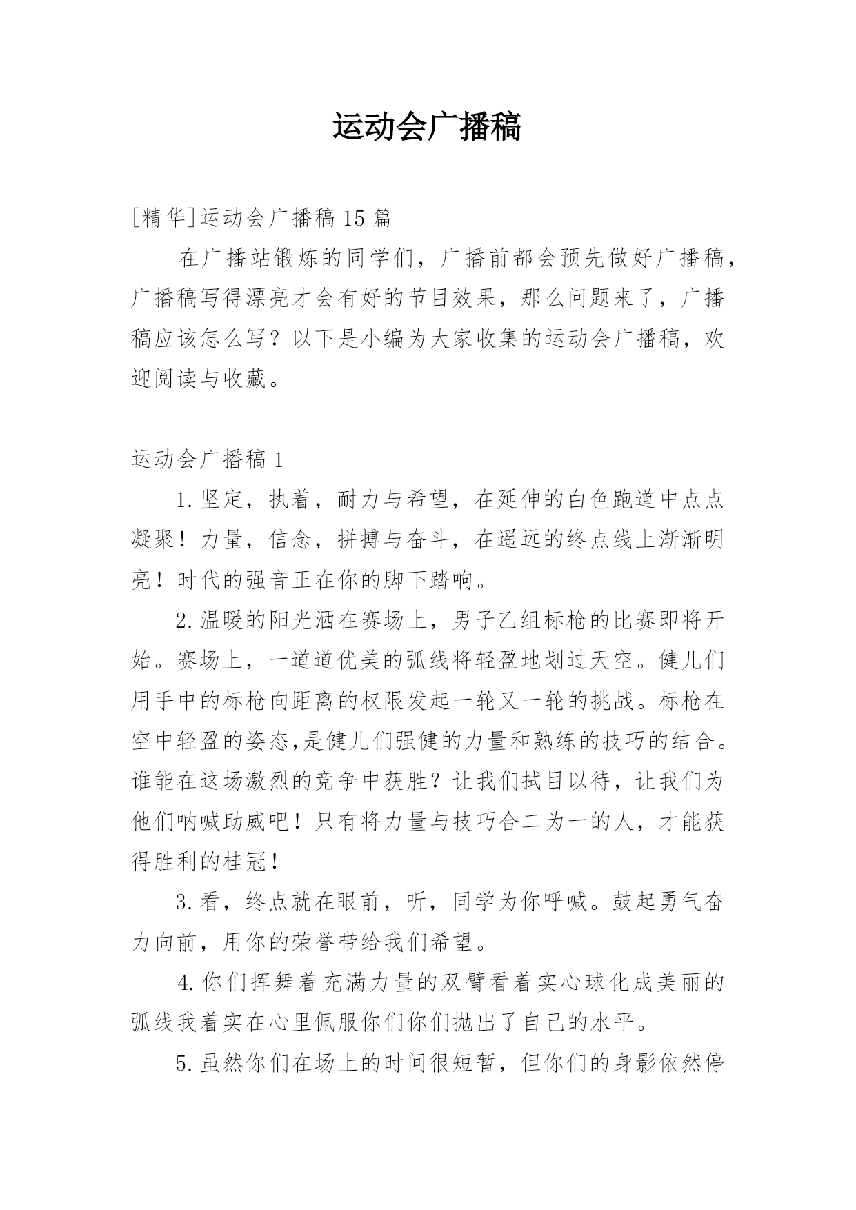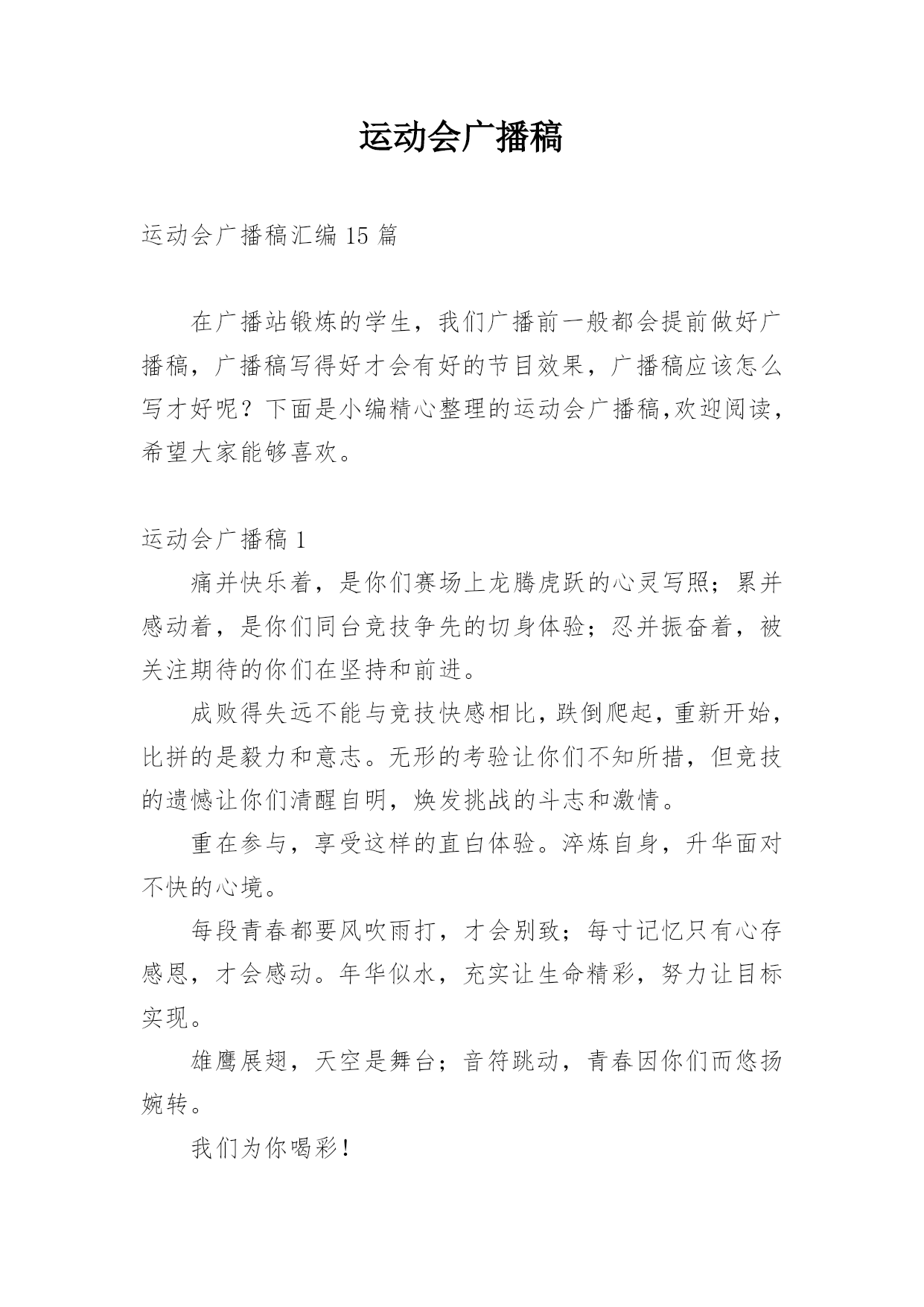 运动会广播稿运动会广播稿汇编15篇在广播站锻炼的学生,我们广播前一般都会提前做好广播稿,广播稿写得好才会有好的节目效果,广播稿应该怎么写才好呢?下面是小编精心整理的运动会广播稿,欢迎阅读,希望大家能够喜欢。运动会广播稿1痛并快乐着,是你们赛场上龙腾虎跃的心灵写照;累并感动着,是你们同台竞技争先的切身体验;忍并振奋着,被关注期待的你们在坚持和前进。成败得失远不能与竞技快感相比,跌倒爬起,重新开始,比拼的是毅力和意志。无形的考验让你们不知所措,但竞技的遗憾让你们清醒自明,焕发挑战的斗志和激情。重在参与,享受这