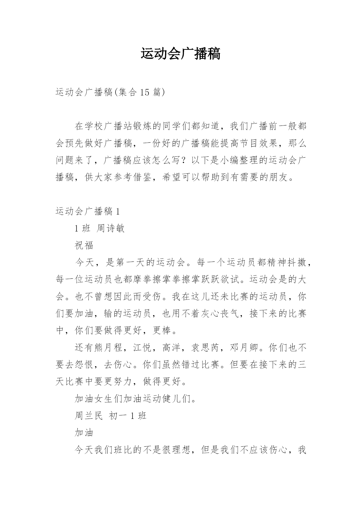 运动会广播稿运动会广播稿(集合15篇)在学校广播站锻炼的同学们都知道,我们广播前一般都会预先做好广播稿,一份好的广播稿能提高节目效果,那么问题来了,广播稿应该怎么写?以下是小编整理的运动会广播稿,供大家参考借鉴,希望可以帮助到有需要的朋友。运动会广播稿11班周诗敏祝福今天,是第一天的运动会。每一个运动员都精神抖擞,每一位运动员也都摩拳擦掌拳擦掌跃跃欲试。运动会是的大会。也不曾想因此而受伤。我在这儿还未比赛的运动员,你们要加油,输的运动员,也用不着灰心丧气,接下来的比赛中,你们要做得更好,更棒。还有熊月程,
