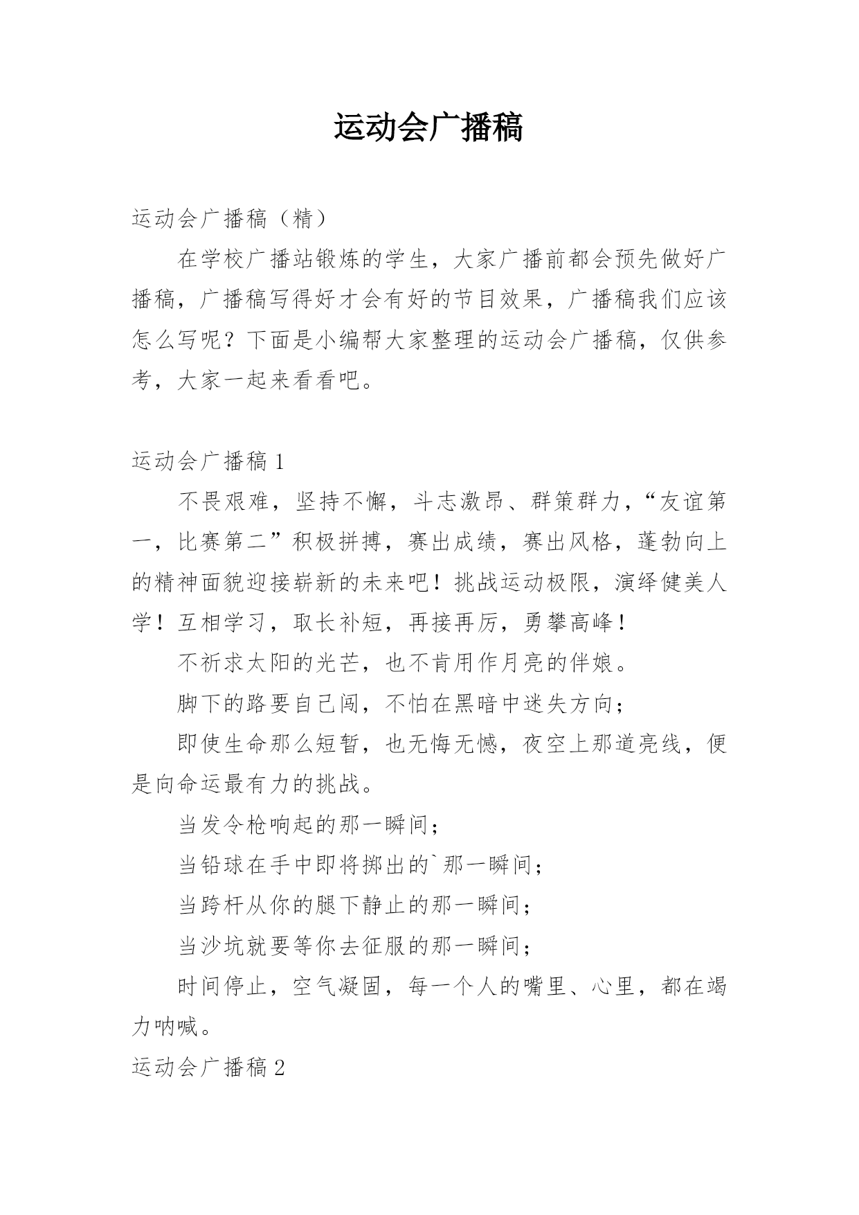 运动会广播稿运动会广播稿(精)在学校广播站锻炼的学生,大家广播前都会预先做好广播稿,广播稿写得好才会有好的节目效果,广播稿我们应该怎么写呢?下面是小编帮大家整理的运动会广播稿,仅供参考,大家一起来看看吧。运动会广播稿1不畏艰难,坚持不懈,斗志激昂、群策群力,“友谊第一,比赛第二”积极拼搏,赛出成绩,赛出风格,蓬勃向上的精神面貌迎接崭新的未来吧!挑战运动极限,演绎健美人学!互相学习,取长补短,再接再厉,勇攀高峰!不祈求太阳的光芒,也不肯用作月亮的伴娘。脚下的路要自己闯,不怕在黑暗中迷失方向;即使生命那么短暂