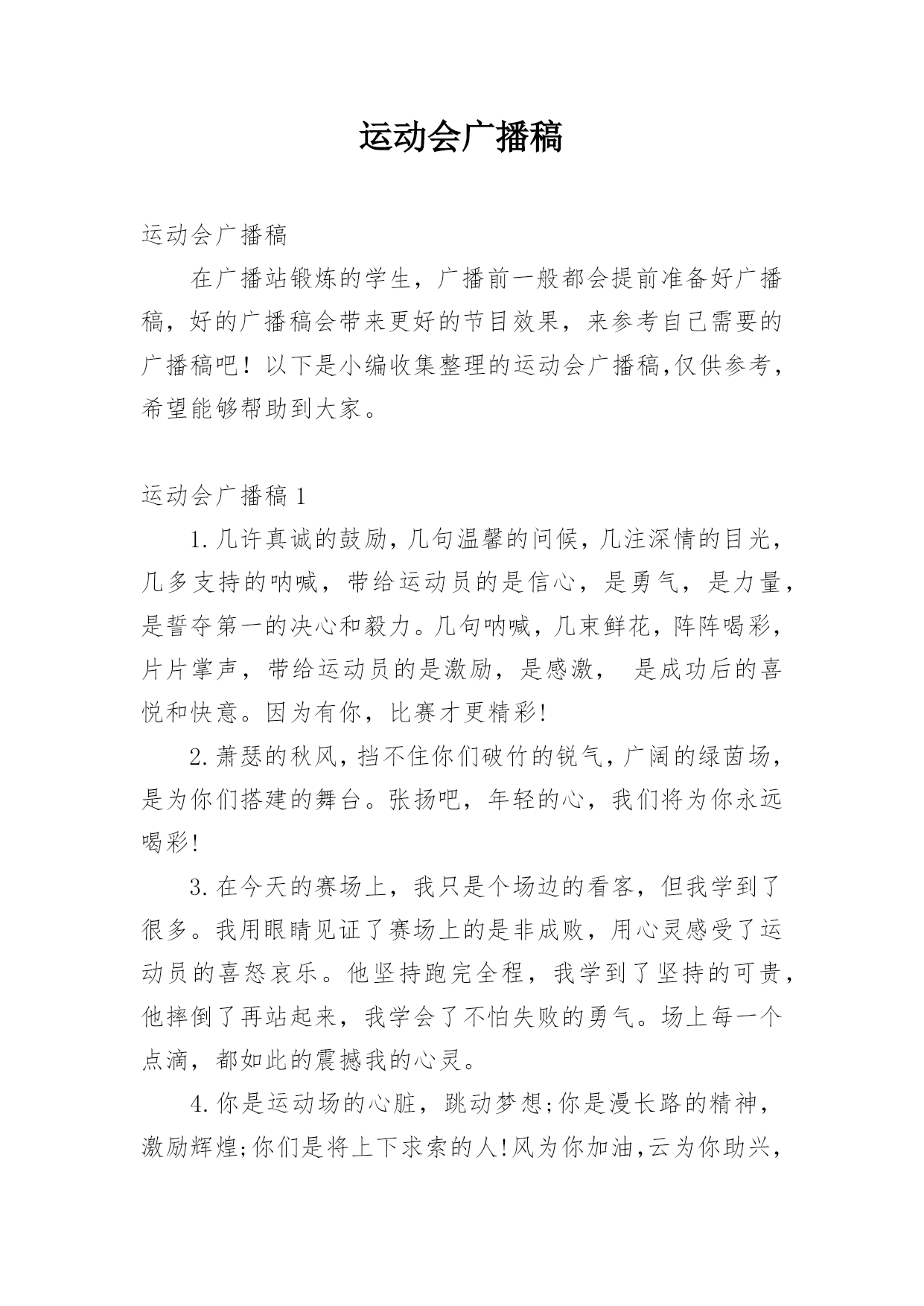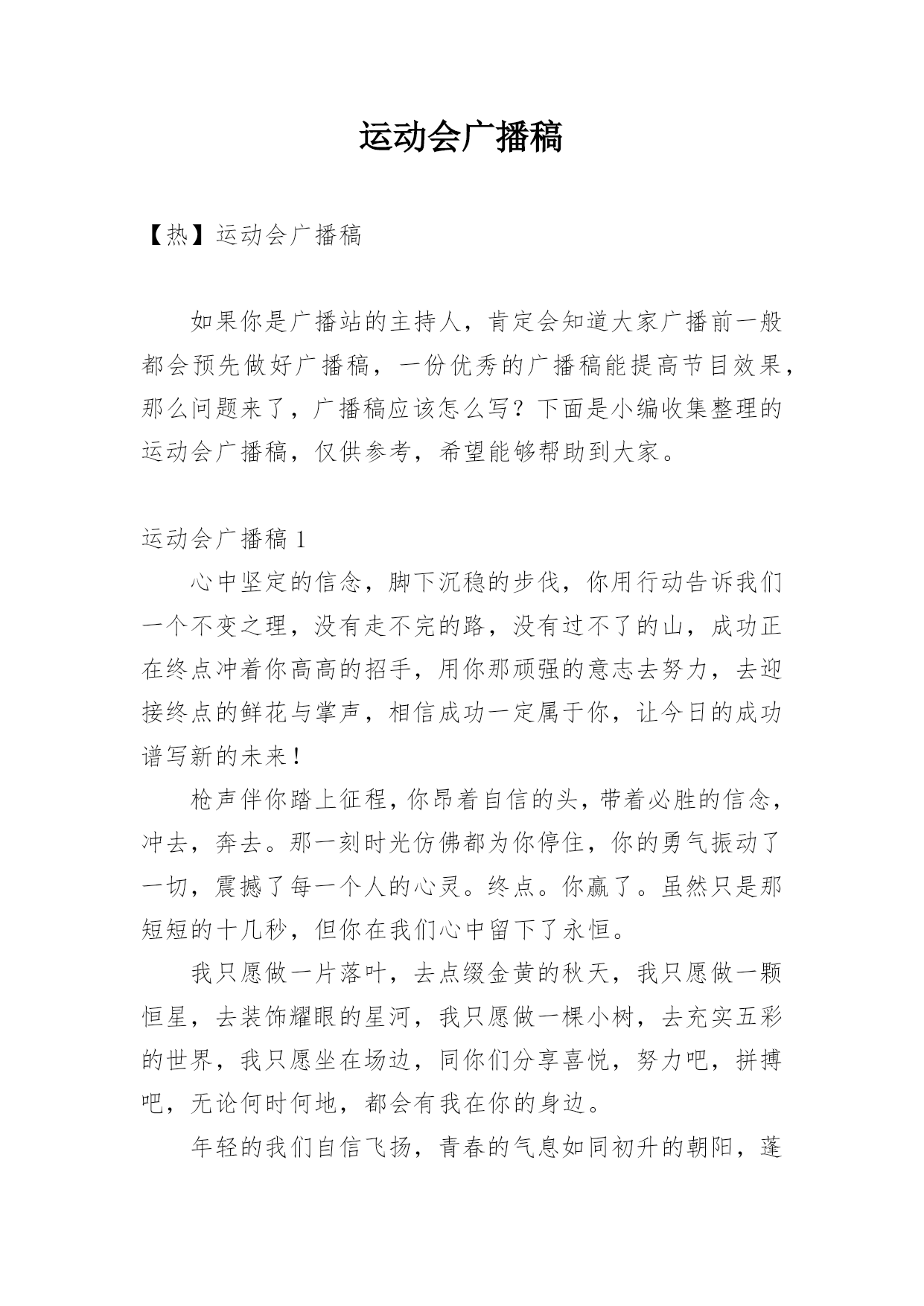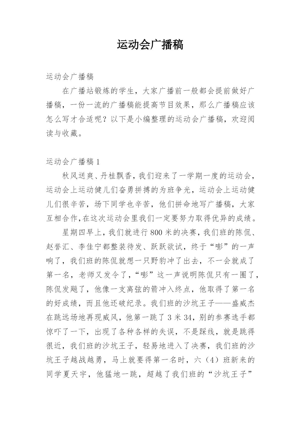 运动会广播稿运动会广播稿在广播站锻炼的学生,大家广播前一般都会提前做好广播稿,一份一流的广播稿能提高节目效果,那么广播稿应该怎么写才合适呢?以下是小编整理的运动会广播稿,欢迎阅读与收藏。运动会广播稿1秋风送爽、丹桂飘香,我们迎来了一学期一度的运动会,运动会上运动健儿们奋勇拼搏的为班争光,运动会上运动健儿们很辛苦,场下同学也辛苦,他们拼命地写广播稿,大家互相合作,在这次运动会里我们一定要努力取得优异的成绩。星期四早上,我们就进行800米的决赛,我们班的陈侃、赵誉汇、李佳宁都整装待发、跃跃欲试,终于“嘭”的一
