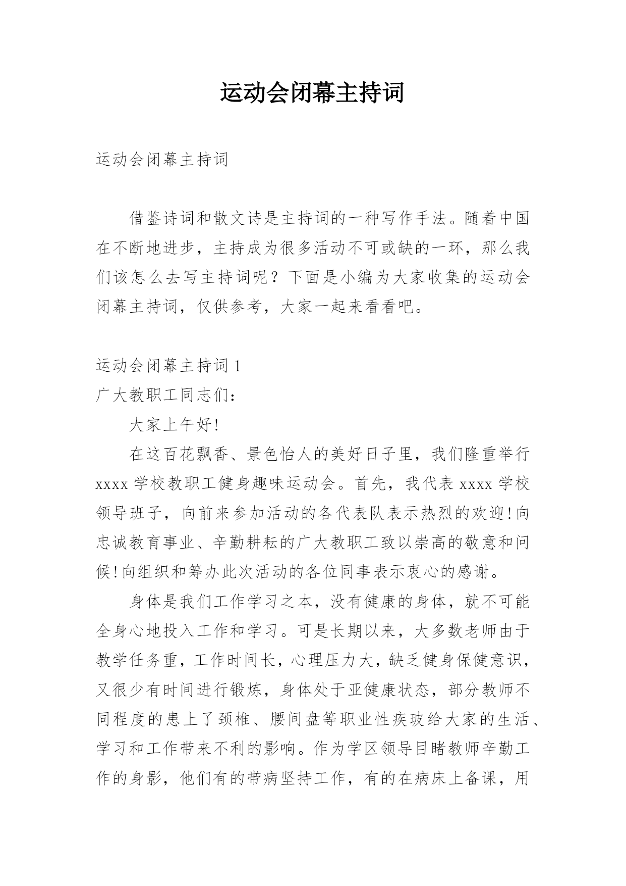 运动会闭幕主持词运动会闭幕主持词借鉴诗词和散文诗是主持词的一种写作手法。随着中国在不断地进步,主持成为很多活动不可或缺的一环,那么我们该怎么去写主持词呢?下面是小编为大家收集的运动会闭幕主持词,仅供参考,大家一起来看看吧。运动会闭幕主持词1广大教职工同志们:大家上午好!在这百花飘香、景色怡人的美好日子里,我们隆重举行xxxx学校教职工健身趣味运动会。首先,我代表xxxx学校领导班子,向前来参加活动的各代表队表示热烈的欢迎!向忠诚教育事业、辛勤耕耘的广大教职工致以崇高的敬意和问候!向组织和筹办此次活动的各位