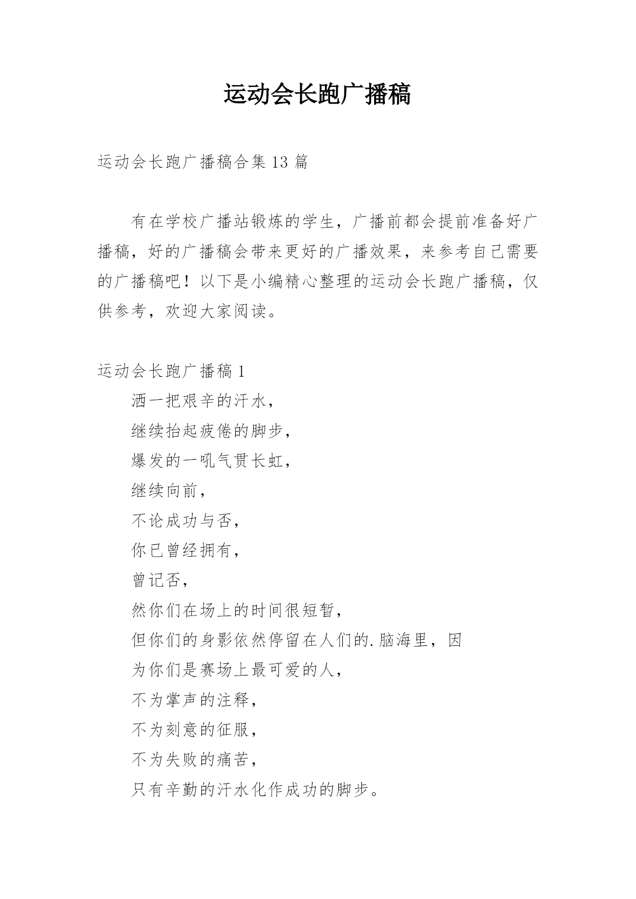 运动会长跑广播稿运动会长跑广播稿合集13篇有在学校广播站锻炼的学生,广播前都会提前准备好广播稿,好的广播稿会带来更好的广播效果,来参考自己需要的广播稿吧!以下是小编精心整理的运动会长跑广播稿,仅供参考,欢迎大家阅读。运动会长跑广播稿1洒一把艰辛的汗水,继续抬起疲倦的脚步,爆发的一吼气贯长虹,继续向前,不论成功与否,你已曾经拥有,曾记否,然你们在场上的时间很短暂,但你们的身影依然停留在人们的.脑海里,因为你们是赛场上最可爱的人,不为掌声的注释,不为刻意的征服,不为失败的痛苦,只有辛勤的汗水化作成功的脚步。在