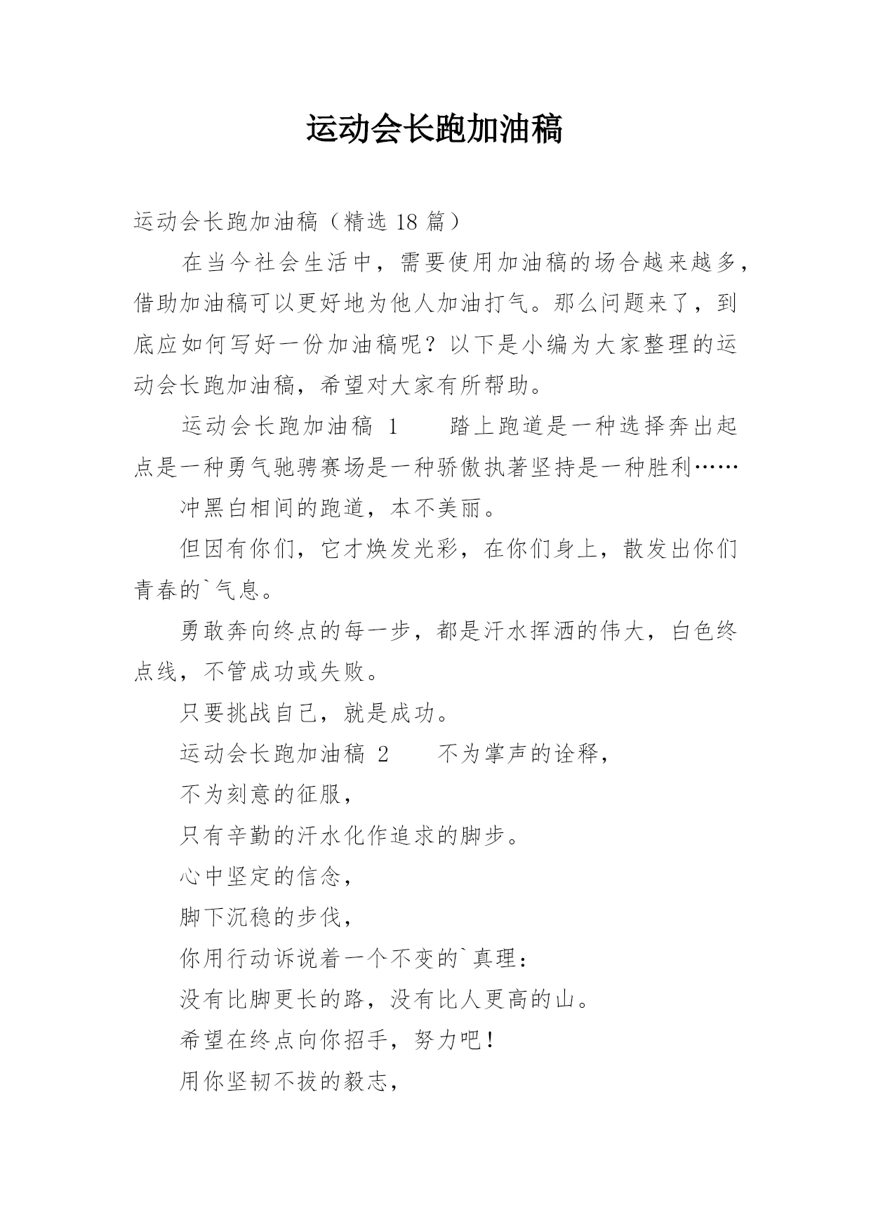 运动会长跑加油稿运动会长跑加油稿(精选18篇)在当今社会生活中,需要使用加油稿的场合越来越多,借助加油稿可以更好地为他人加油打气。那么问题来了,到底应如何写好一份加油稿呢?以下是小编为大家整理的运动会长跑加油稿,希望对大家有所帮助。运动会长跑加油稿1踏上跑道是一种选择奔出起点是一种勇气驰骋赛场是一种骄傲执著坚持是一种胜利……冲黑白相间的跑道,本不美丽。但因有你们,它才焕发光彩,在你们身上,散发出你们青春的`气息。勇敢奔向终点的每一步,都是汗水挥洒的伟大,白色终点线,不管成功或失败。只要挑战自己,就是成功。