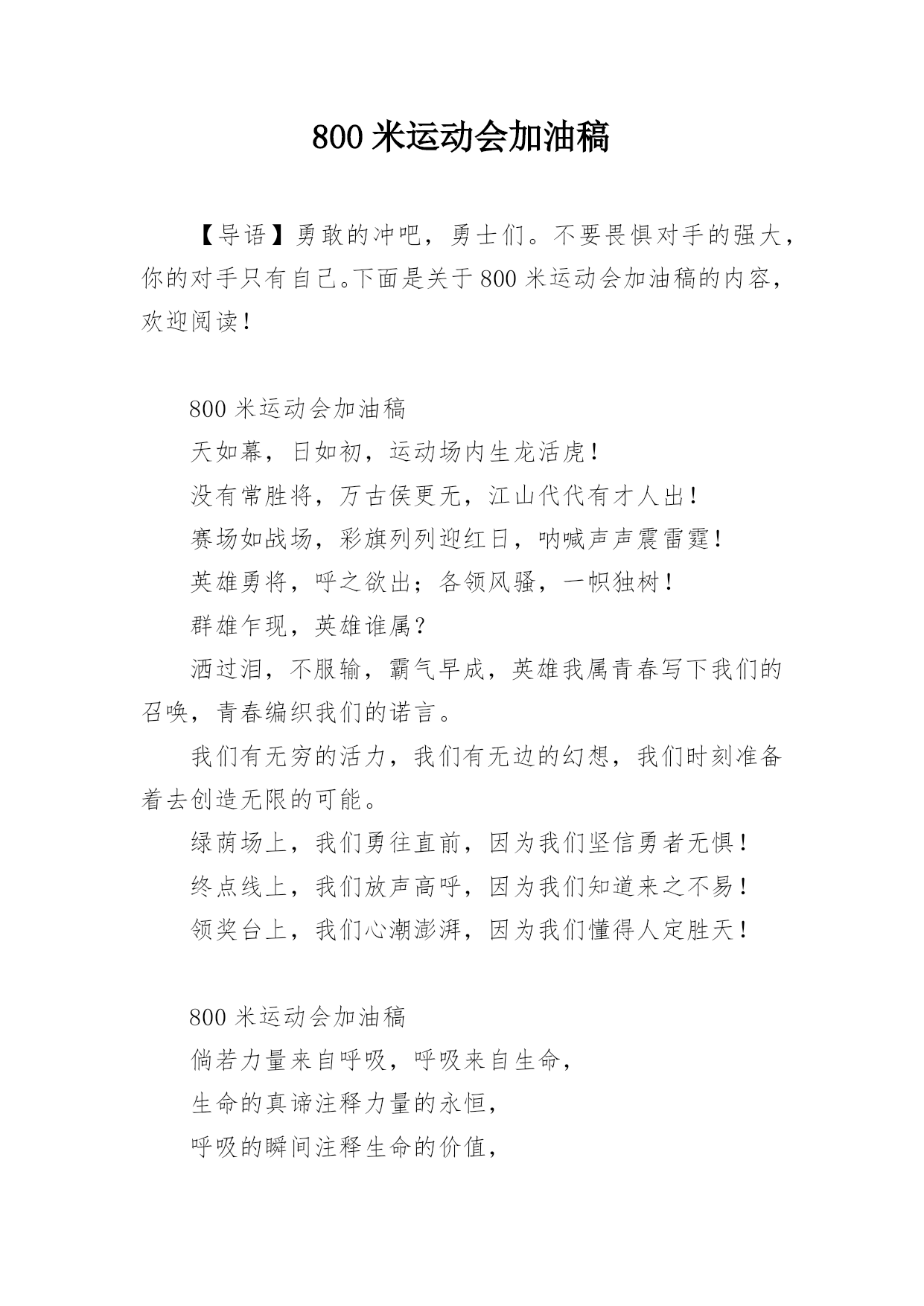 800米运动会加油稿【导语】勇敢的冲吧,勇士们。不要畏惧对手的强大,你的对手只有自己。下面是关于800米运动会加油稿的内容,欢迎阅读!800米运动会加油稿天如幕,日如初,运动场内生龙活虎!没有常胜将,万古侯更无,江山代代有才人出!赛场如战场,彩旗列列迎红日,呐喊声声震雷霆!英雄勇将,呼之欲出;各领风骚,一帜独树!群雄乍现,英雄谁属?洒过泪,不服输,霸气早成,英雄我属青春写下我们的召唤,青春编织我们的诺言。我们有无穷的活力,我们有无边的幻想,我们时刻准备着去创造无限的可能。绿荫场上,我们勇往直前,因为我们坚