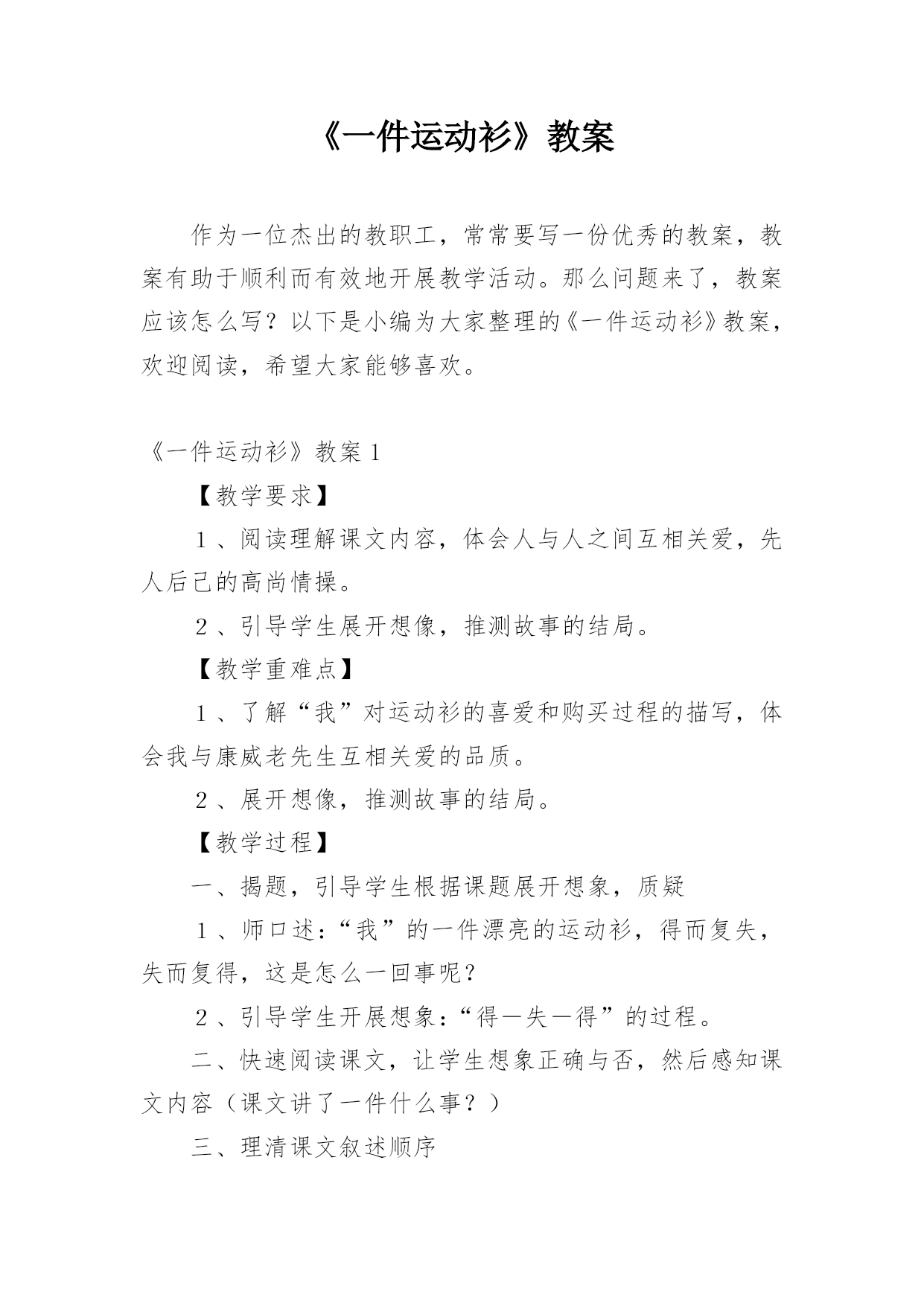 《一件运动衫》教案作为一位杰出的教职工,常常要写一份优秀的教案,教案有助于顺利而有效地开展教学活动。那么问题来了,教案应该怎么写?以下是小编为大家整理的《一件运动衫》教案,欢迎阅读,希望大家能够喜欢。《一件运动衫》教案1【教学要求】1、阅读理解课文内容,体会人与人之间互相关爱,先人后己的高尚情操。2、引导学生展开想像,推测故事的结局。【教学重难点】1、了解“我”对运动衫的喜爱和购买过程的描写,体会我与康威老先生互相关爱的品质。2、展开想像,推测故事的结局。【教学过程】一、揭题,引导学生根据课题展开想象,质