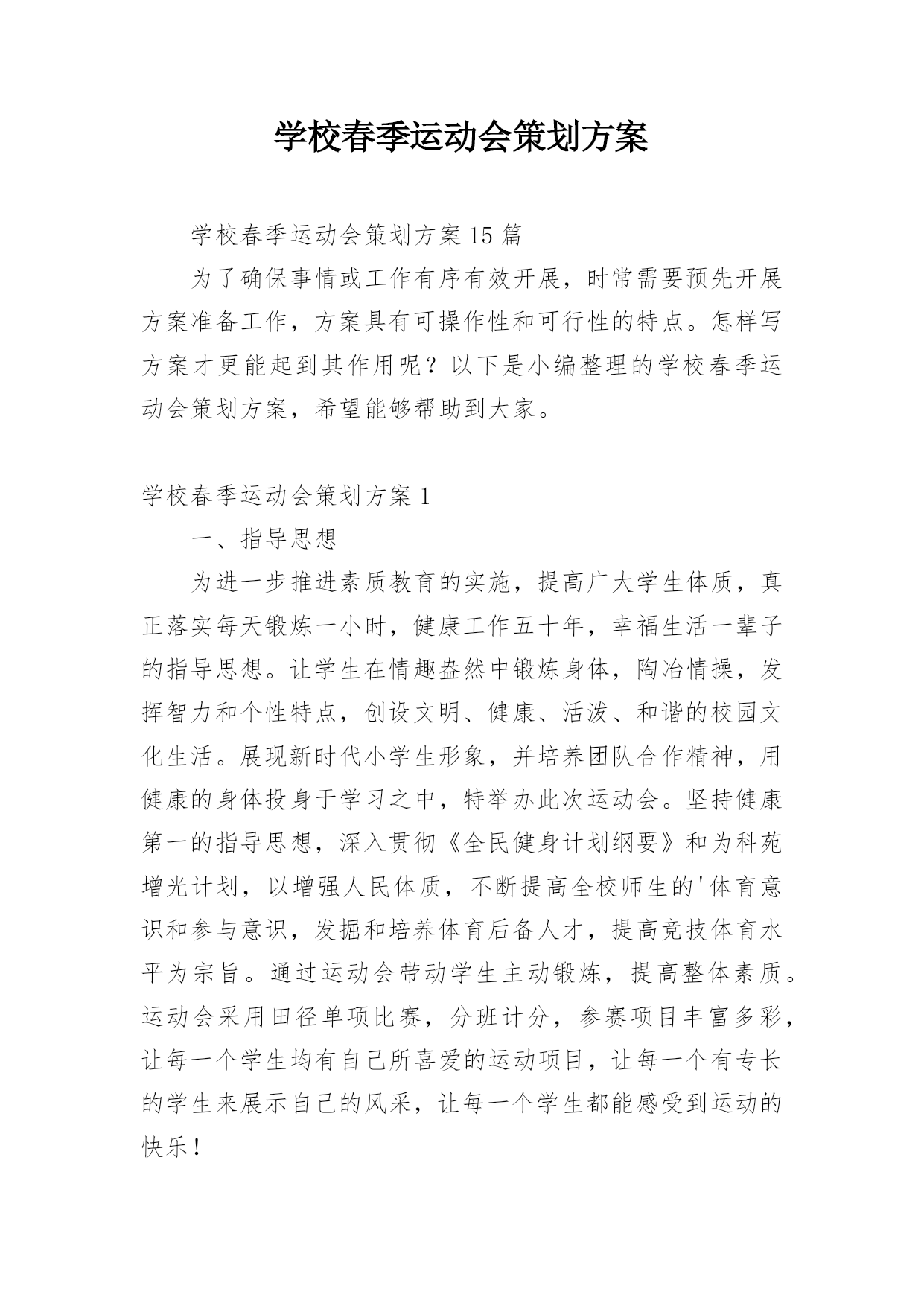 学校春季运动会策划方案学校春季运动会策划方案15篇为了确保事情或工作有序有效开展,时常需要预先开展方案准备工作,方案具有可操作性和可行性的特点。怎样写方案才更能起到其作用呢?以下是小编整理的学校春季运动会策划方案,希望能够帮助到大家。学校春季运动会策划方案1一、指导思想为进一步推进素质教育的实施,提高广大学生体质,真正落实每天锻炼一小时,健康工作五十年,幸福生活一辈子的指导思想。让学生在情趣盎然中锻炼身体,陶冶情操,发挥智力和个性特点,创设文明、健康、活泼、和谐的校园文化生活。展现新时代小学生形象,并培养