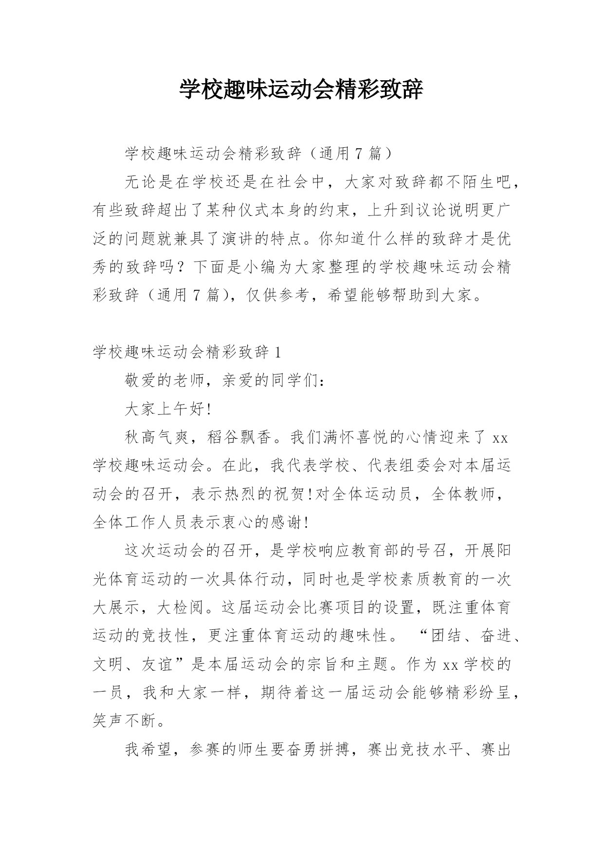 学校趣味运动会精彩致辞学校趣味运动会精彩致辞(通用7篇)无论是在学校还是在社会中,大家对致辞都不陌生吧,有些致辞超出了某种仪式本身的约束,上升到议论说明更广泛的问题就兼具了演讲的特点。你知道什么样的致辞才是优秀的致辞吗?下面是小编为大家整理的学校趣味运动会精彩致辞(通用7篇),仅供参考,希望能够帮助到大家。学校趣味运动会精彩致辞1敬爱的老师,亲爱的同学们:大家上午好!秋高气爽,稻谷飘香。我们满怀喜悦的心情迎来了xx学校趣味运动会。在此,我代表学校、代表组委会对本届运动会的召开,表示热烈的祝贺!对全体运动员