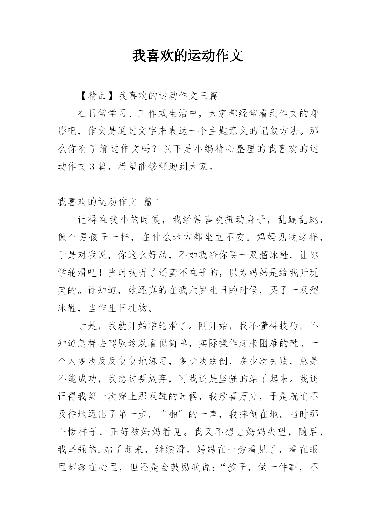 我喜欢的运动作文【精品】我喜欢的运动作文三篇在日常学习、工作或生活中,大家都经常看到作文的身影吧,作文是通过文字来表达一个主题意义的记叙方法。那么你有了解过作文吗?以下是小编精心整理的我喜欢的运动作文3篇,希望能够帮助到大家。我喜欢的运动作文篇1记得在我小的时候,我经常喜欢扭动身子,乱蹦乱跳,像个男孩子一样,在什么地方都坐立不安。妈妈见我这样,于是对我说,你这么好动,不如我给你买一双溜冰鞋,让你学轮滑吧!当时我听了还蛮不在乎的,以为妈妈是给我开玩笑的。谁知道,她还真的在我六岁生日的时候,买了一双溜冰鞋,当