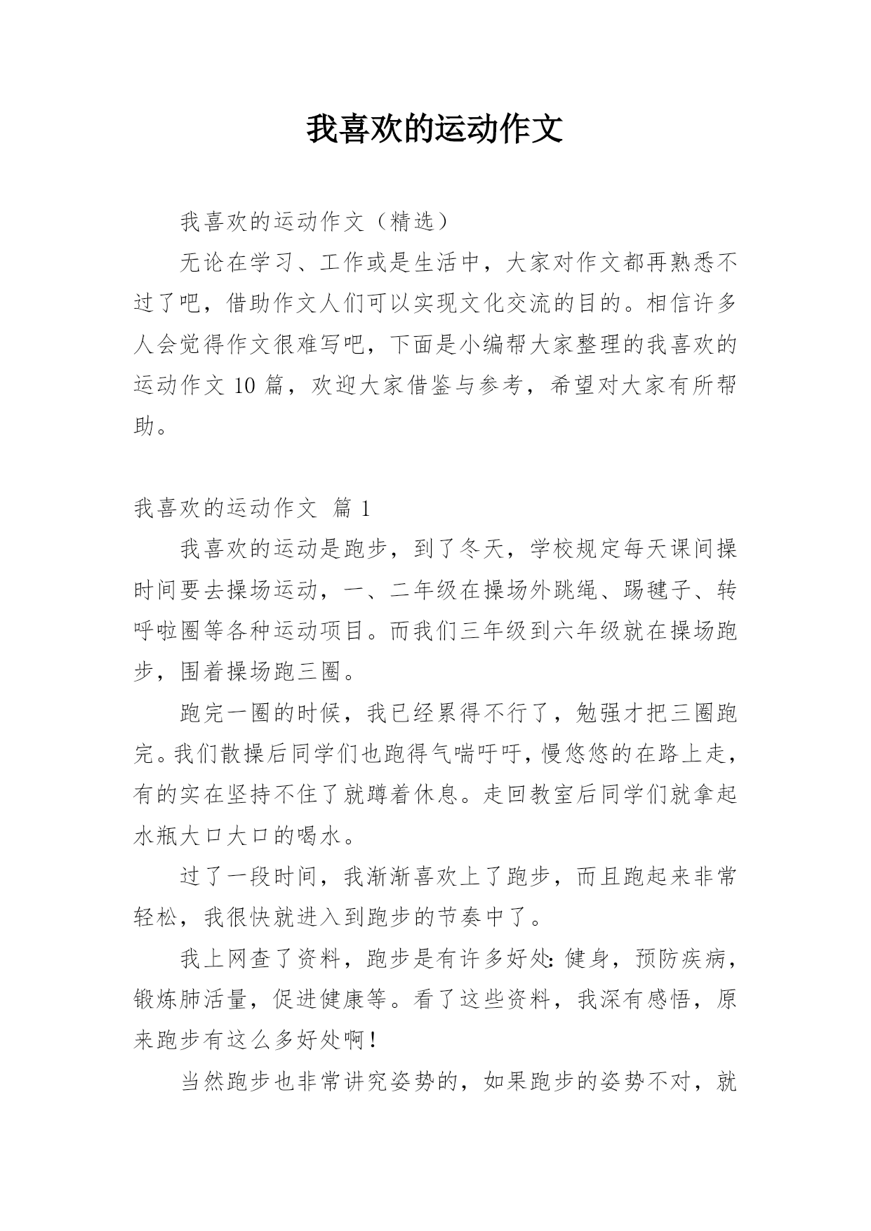 我喜欢的运动作文我喜欢的运动作文(精选)无论在学习、工作或是生活中,大家对作文都再熟悉不过了吧,借助作文人们可以实现文化交流的目的。相信许多人会觉得作文很难写吧,下面是小编帮大家整理的我喜欢的运动作文10篇,欢迎大家借鉴与参考,希望对大家有所帮助。我喜欢的运动作文篇1我喜欢的运动是跑步,到了冬天,学校规定每天课间操时间要去操场运动,一、二年级在操场外跳绳、踢毽子、转呼啦圈等各种运动项目。而我们三年级到六年级就在操场跑步,围着操场跑三圈。跑完一圈的时候,我已经累得不行了,勉强才把三圈跑完。我们散操后同学们也