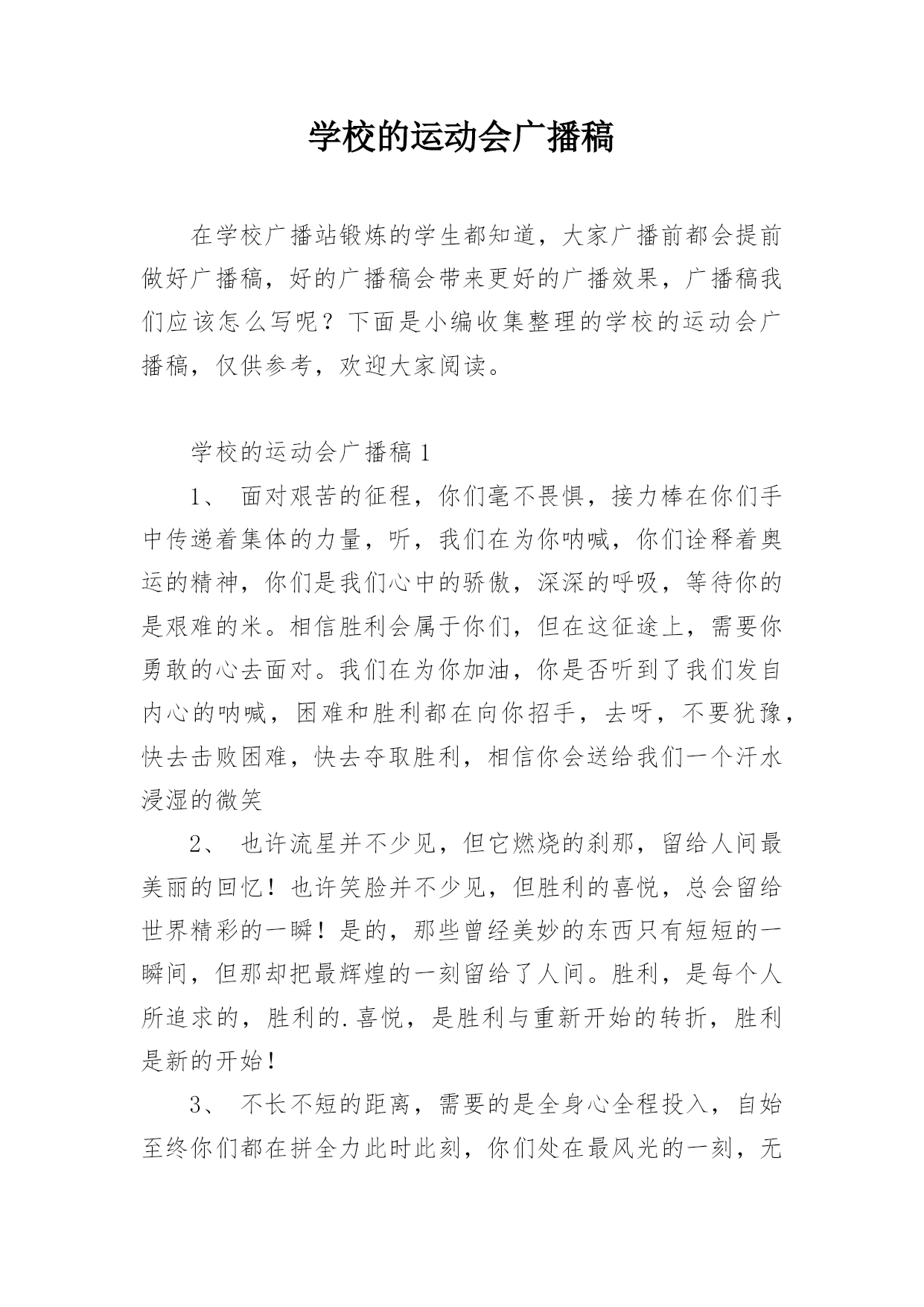 学校的运动会广播稿在学校广播站锻炼的学生都知道,大家广播前都会提前做好广播稿,好的广播稿会带来更好的广播效果,广播稿我们应该怎么写呢?下面是小编收集整理的学校的运动会广播稿,仅供参考,欢迎大家阅读。学校的运动会广播稿11、面对艰苦的征程,你们毫不畏惧,接力棒在你们手中传递着集体的力量,听,我们在为你呐喊,你们诠释着奥运的精神,你们是我们心中的骄傲,深深的呼吸,等待你的是艰难的米。相信胜利会属于你们,但在这征途上,需要你勇敢的心去面对。我们在为你加油,你是否听到了我们发自内心的呐喊,困难和胜利都在向你招手,