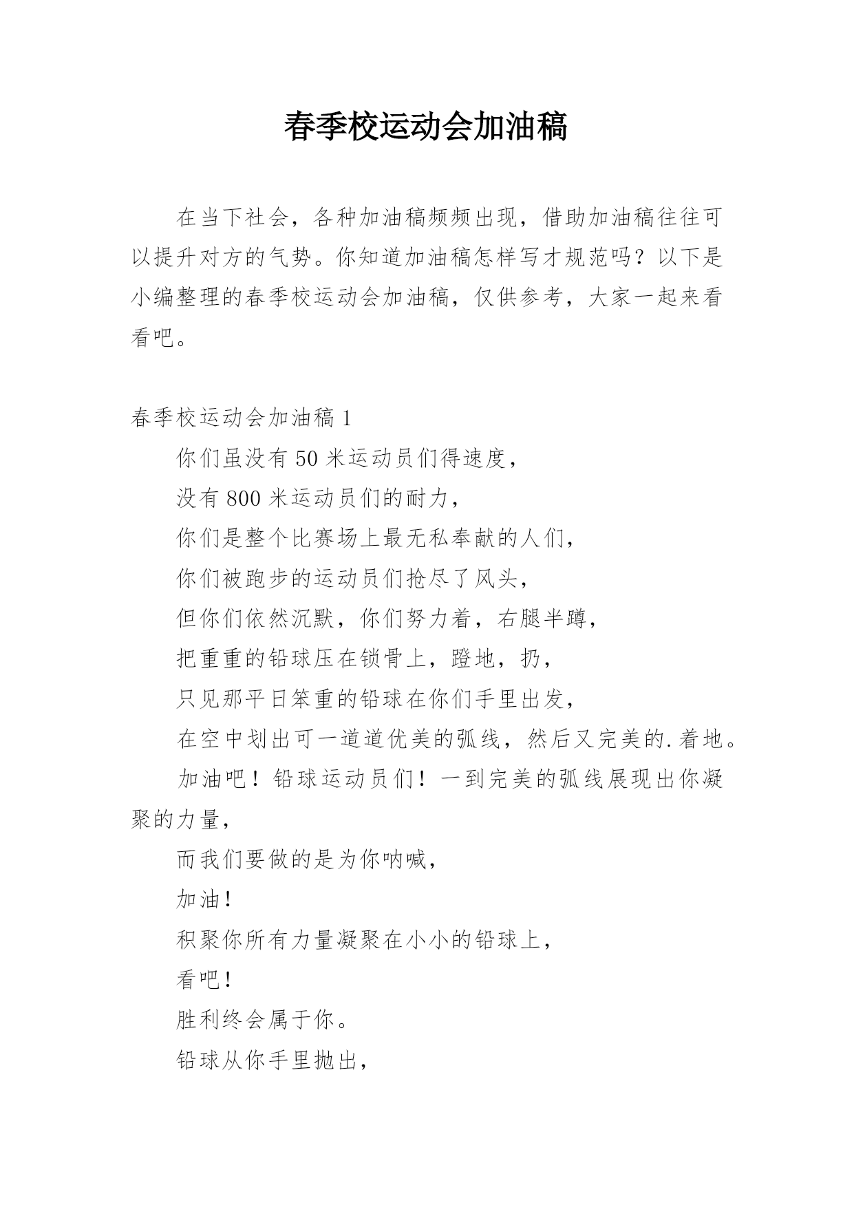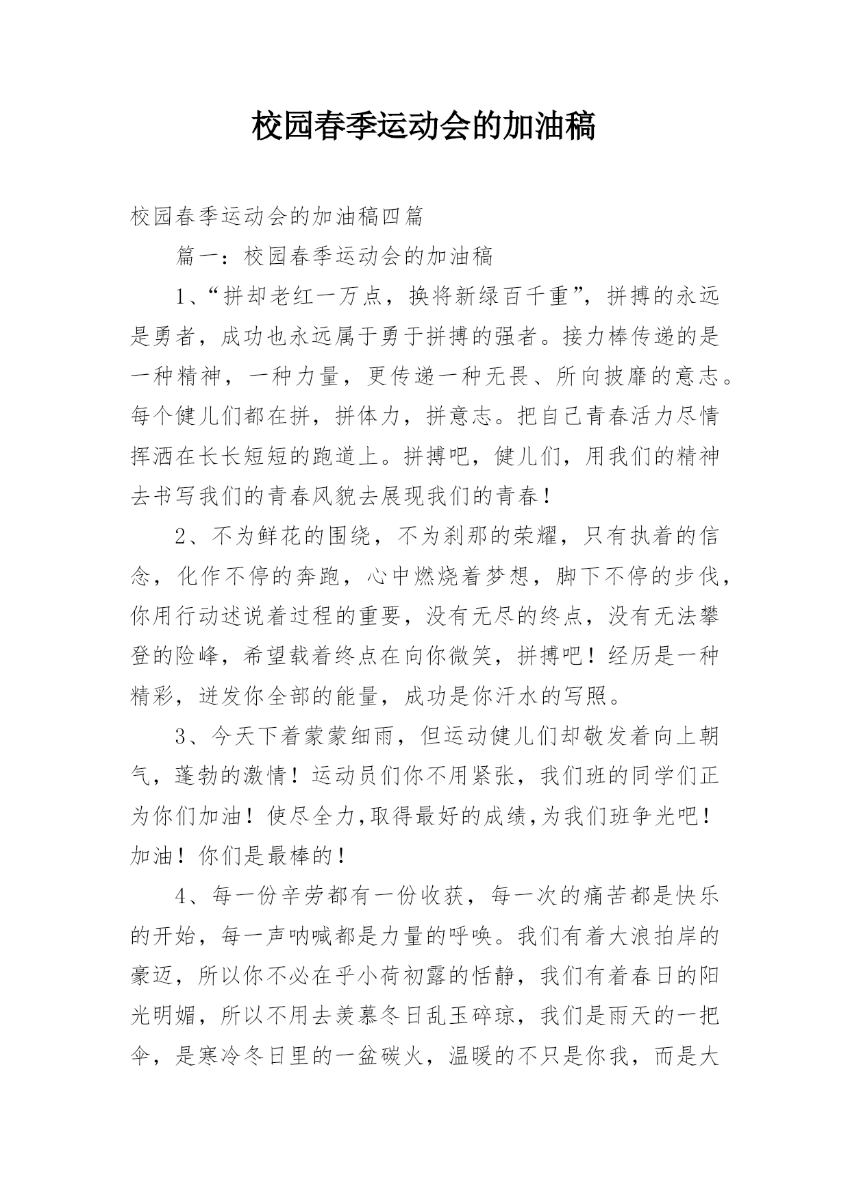 校园春季运动会的加油稿校园春季运动会的加油稿四篇篇一:校园春季运动会的加油稿1、“拼却老红一万点,换将新绿百千重”,拼搏的永远是勇者,成功也永远属于勇于拼搏的强者。接力棒传递的是一种精神,一种力量,更传递一种无畏、所向披靡的意志。每个健儿们都在拼,拼体力,拼意志。把自己青春活力尽情挥洒在长长短短的跑道上。拼搏吧,健儿们,用我们的精神去书写我们的青春风貌去展现我们的青春!2、不为鲜花的围绕,不为刹那的荣耀,只有执着的信念,化作不停的奔跑,心中燃烧着梦想,脚下不停的步伐,你用行动述说着过程的重要,没有无尽的终