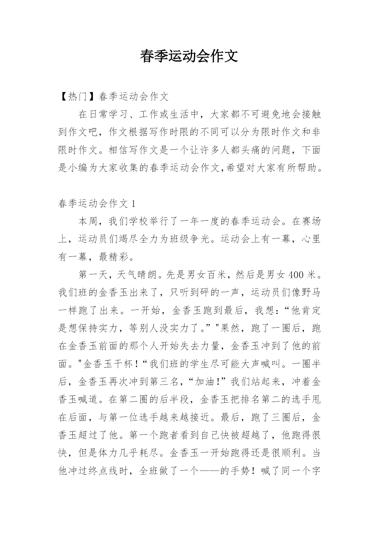 春季运动会作文【热门】春季运动会作文在日常学习、工作或生活中,大家都不可避免地会接触到作文吧,作文根据写作时限的不同可以分为限时作文和非限时作文。相信写作文是一个让许多人都头痛的问题,下面是小编为大家收集的春季运动会作文,希望对大家有所帮助。春季运动会作文1本周,我们学校举行了一年一度的春季运动会。在赛场上,运动员们竭尽全力为班级争光。运动会上有一幕,心里有一幕,最精彩。第一天,天气晴朗。先是男女百米,然后是男女400米。我们班的金香玉出来了,只听到砰的一声,运动员们像野马一样跑了出来。一开始,金香玉跑到