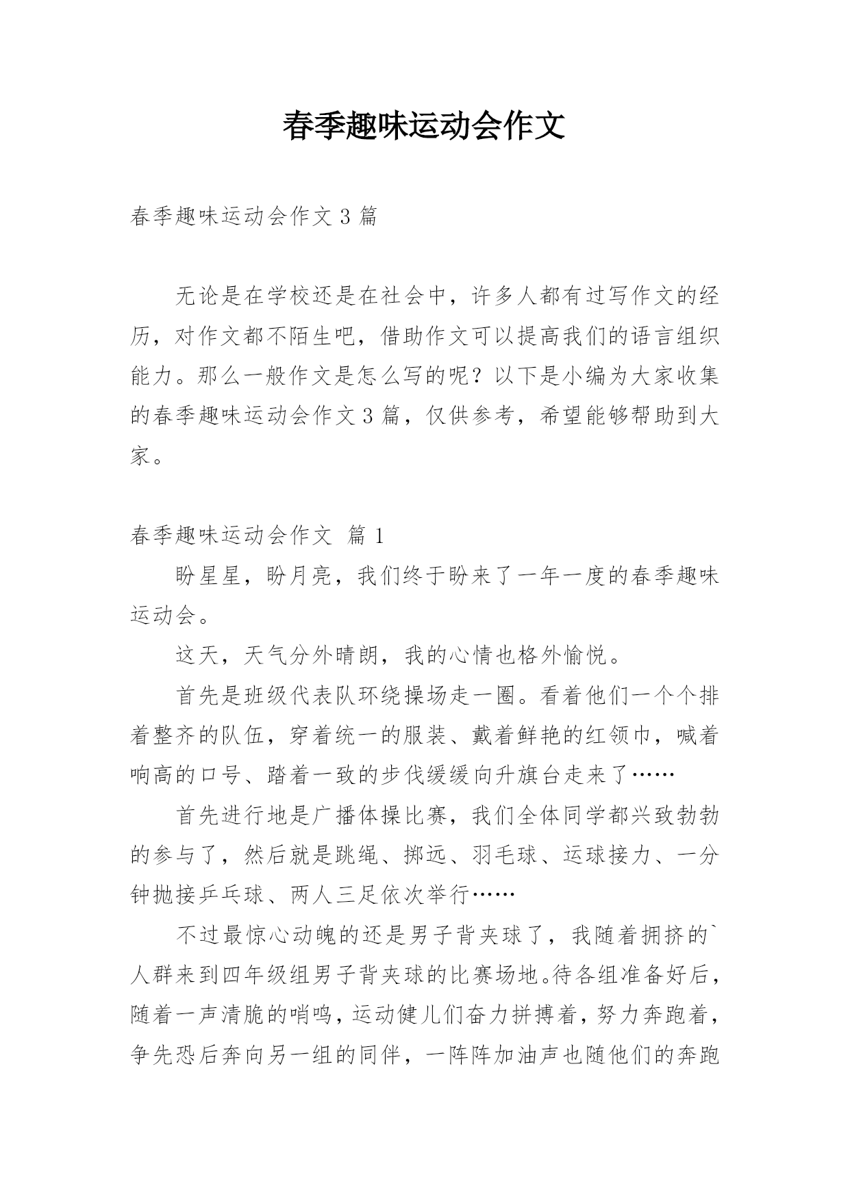 春季趣味运动会作文春季趣味运动会作文3篇无论是在学校还是在社会中,许多人都有过写作文的经历,对作文都不陌生吧,借助作文可以提高我们的语言组织能力。那么一般作文是怎么写的呢?以下是小编为大家收集的春季趣味运动会作文3篇,仅供参考,希望能够帮助到大家。春季趣味运动会作文篇1盼星星,盼月亮,我们终于盼来了一年一度的春季趣味运动会。这天,天气分外晴朗,我的心情也格外愉悦。首先是班级代表队环绕操场走一圈。看着他们一个个排着整齐的队伍,穿着统一的服装、戴着鲜艳的红领巾,喊着响高的口号、踏着一致的步伐缓缓向升旗台走来了