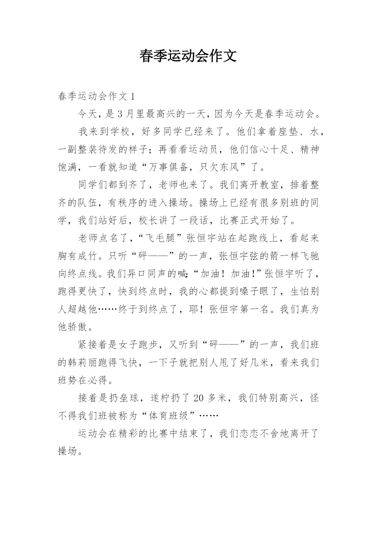 春季运动会作文春季运动会作文1今天,是3月里最高兴的一天,因为今天是春季运动会。我来到学校,好多同学已经来了。他们拿着座垫、水,一副整装待发的样子;再看看运动员,他们信心十足、精神饱满,一看就知道“万事俱备,只欠东风”了。同学们都到齐了,老师也来了。我们离开教室,排着整齐的队伍,有秩序的进入操场。操场上已经有很多别班的同学,我们站好后,校长讲了一段话,比赛正式开始了。老师点名了,“飞毛腿”张恒宇站在起跑线上,看起来胸有成竹。只听“砰——”的一声,张恒宇弦的箭一样飞驰向终点线。我们异口同声的喊:“加油!加油