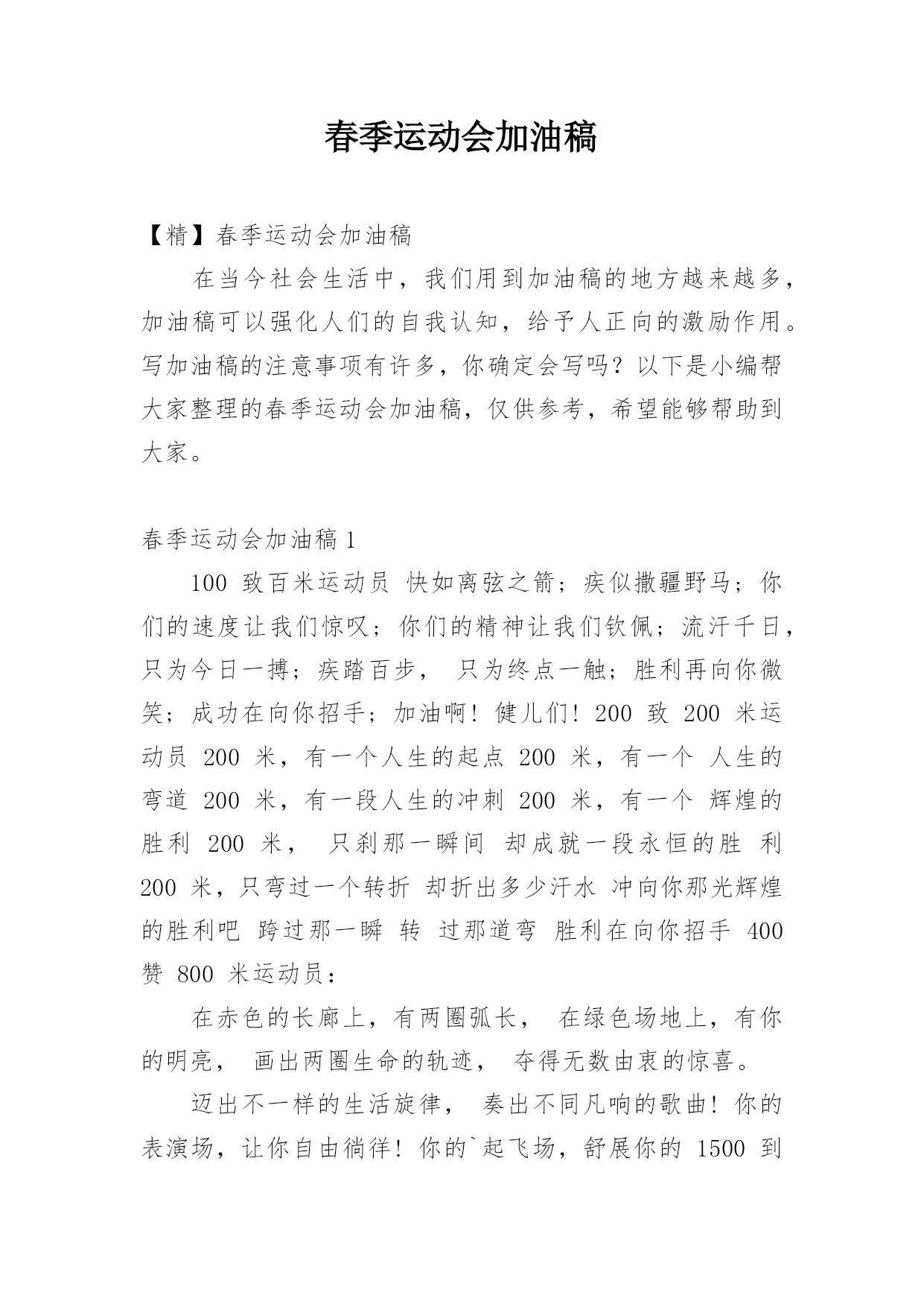 春季运动会加油稿【精】春季运动会加油稿在当今社会生活中,我们用到加油稿的地方越来越多,加油稿可以强化人们的自我认知,给予人正向的激励作用。写加油稿的注意事项有许多,你确定会写吗?以下是小编帮大家整理的春季运动会加油稿,仅供参考,希望能够帮助到大家。春季运动会加油稿1100致百米运动员快如离弦之箭;疾似撒疆野马;你们的速度让我们惊叹;你们的精神让我们钦佩;流汗千日,只为今日一搏;疾踏百步,只为终点一触;胜利再向你微笑;成功在向你招手;加油啊!健儿们!200致200米运动员200米,有一个人生的起点200米,