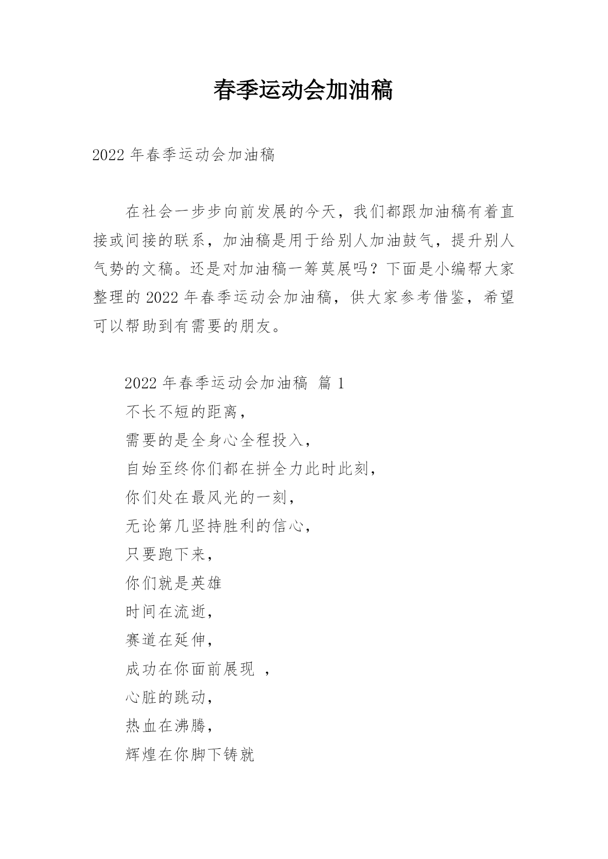 春季运动会加油稿2022年春季运动会加油稿在社会一步步向前发展的今天,我们都跟加油稿有着直接或间接的联系,加油稿是用于给别人加油鼓气,提升别人气势的文稿。还是对加油稿一筹莫展吗?下面是小编帮大家整理的2022年春季运动会加油稿,供大家参考借鉴,希望可以帮助到有需要的朋友。2022年春季运动会加油稿篇1不长不短的距离,需要的是全身心全程投入,自始至终你们都在拼全力此时此刻,你们处在最风光的一刻,无论第几坚持胜利的信心,只要跑下来,你们就是英雄时间在流逝,赛道在延伸,成功在你面前展现,心脏的跳动,热血在沸腾,