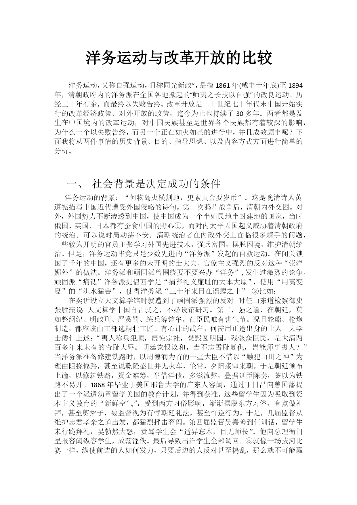 洋务运动与改革开放的比较洋务运动,又称自强运动,旧称“同光新政”,是指1861年(咸丰十年底)至1894年,清朝政府内的洋务派在全国各地掀起的“师夷之长技以自强”的改良运动。历经三十年有余,而最终以失败告终。改革开放是二十世纪七十年代末中国开始实行的改革经济政策、对外开放的政策,迄今为止也持续了30多年。两者都是发生在中国境内的改革运动,对中国民族甚至是世界各个民族都有着较深的影响,为什么一个以失败告终,而另一个正在如火如荼的进行中,并且成效颇丰呢?下面我将从两件事情的历史背景、目的、指导思想、以及内容方