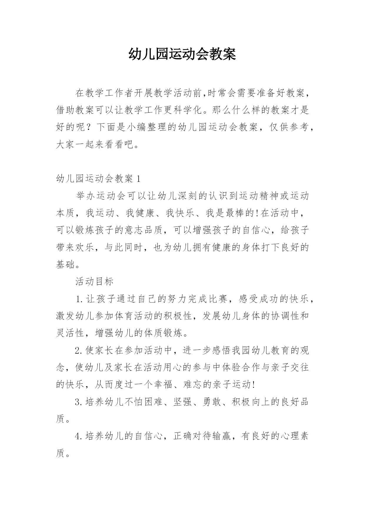幼儿园运动会教案在教学工作者开展教学活动前,时常会需要准备好教案,借助教案可以让教学工作更科学化。那么什么样的教案才是好的呢?下面是小编整理的幼儿园运动会教案,仅供参考,大家一起来看看吧。幼儿园运动会教案1举办运动会可以让幼儿深刻的认识到运动精神或运动本质,我运动、我健康、我快乐、我是最棒的!在活动中,可以锻炼孩子的意志品质,可以增强孩子的自信心,给孩子带来欢乐,与此同时,也为幼儿拥有健康的身体打下良好的基础。活动目标1.让孩子通过自己的努力完成比赛,感受成功的快乐,激发幼儿参加体育活动的积极性,发展幼儿
