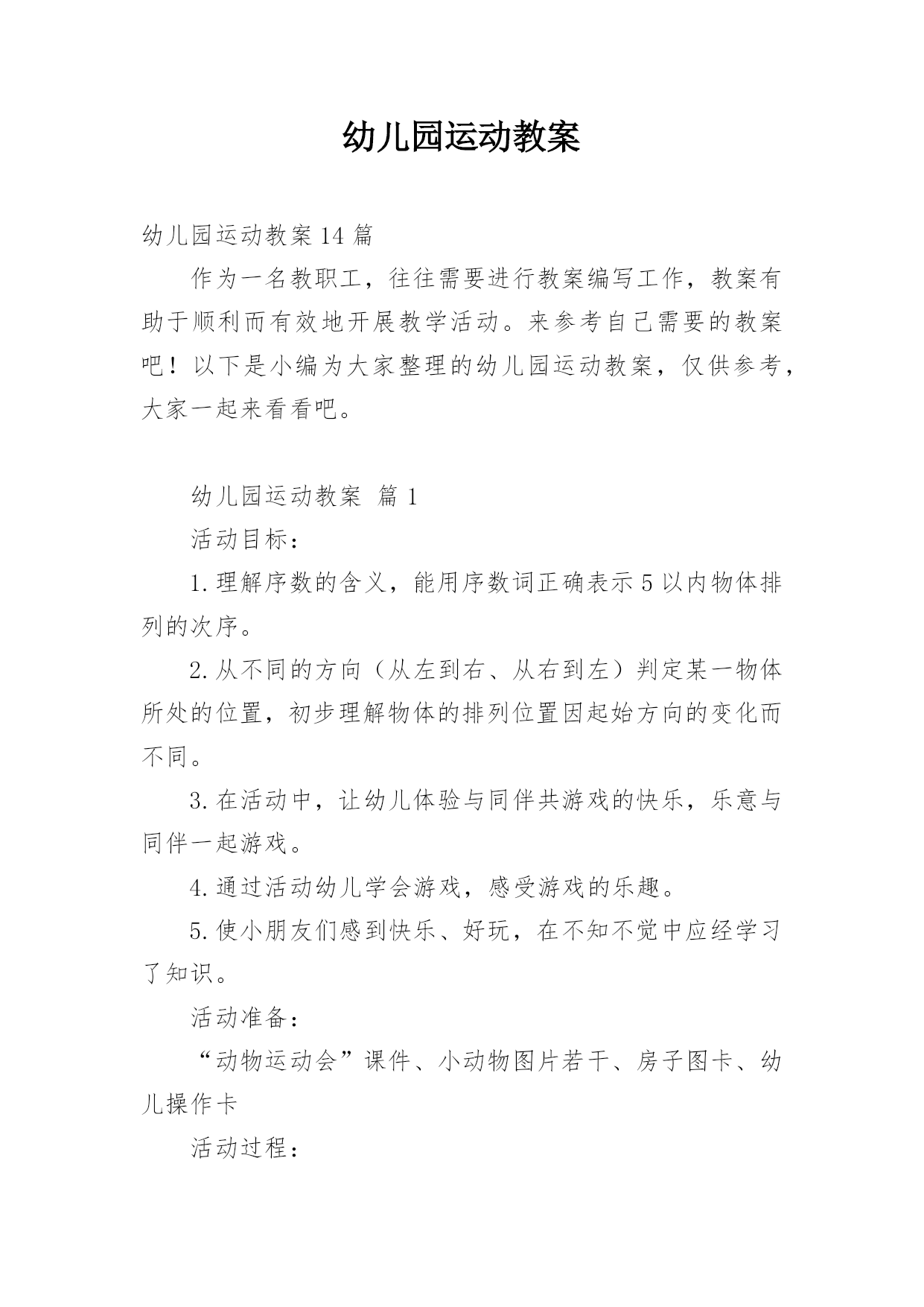 幼儿园运动教案幼儿园运动教案14篇作为一名教职工,往往需要进行教案编写工作,教案有助于顺利而有效地开展教学活动。来参考自己需要的教案吧!以下是小编为大家整理的幼儿园运动教案,仅供参考,大家一起来看看吧。幼儿园运动教案篇1活动目标:1.理解序数的含义,能用序数词正确表示5以内物体排列的次序。2.从不同的方向(从左到右、从右到左)判定某一物体所处的位置,初步理解物体的排列位置因起始方向的变化而不同。3.在活动中,让幼儿体验与同伴共游戏的快乐,乐意与同伴一起游戏。4.通过活动幼儿学会游戏,感受游戏的乐趣。5.使