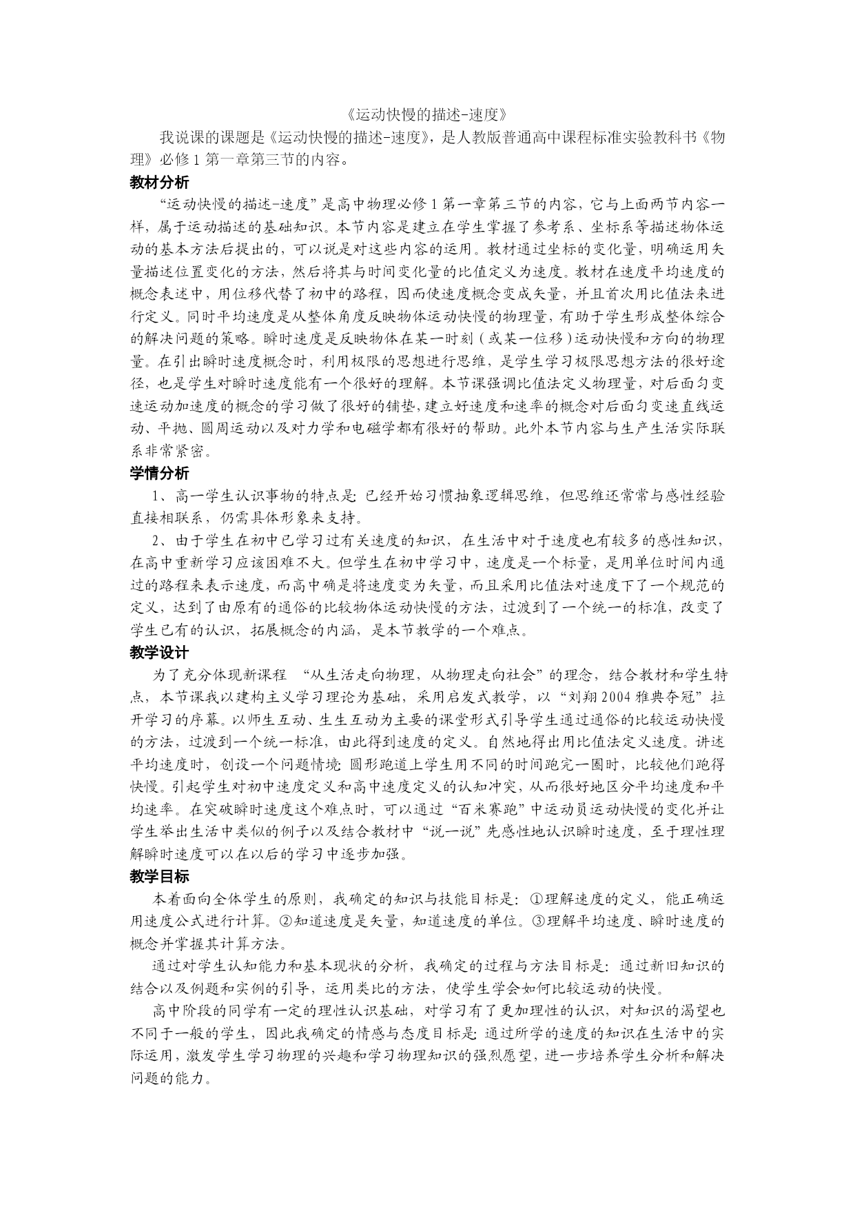 《运动快慢的描述-速度》我说课的课题是《运动快慢的描述-速度》,是人教版普通高中课程标准实验教科书《物理》必修1第一章第三节的内容。教材分析“运动快慢的描述-速度”是高中物理必修1第一章第三节的内容,它与上面两节内容一样,属于运动描述的基础知识。本节内容是建立在学生掌握了参考系、坐标系等描述物体运动的基本方法后提出的,可以说是对这些内容的运用。教材通过坐标的变化量,明确运用矢量描述位置变化的方法,然后将其与时间变化量的比值定义为速度。教材在速度平均速度的概念表述中,用位移代替了初中的路程,因而使速度概念变