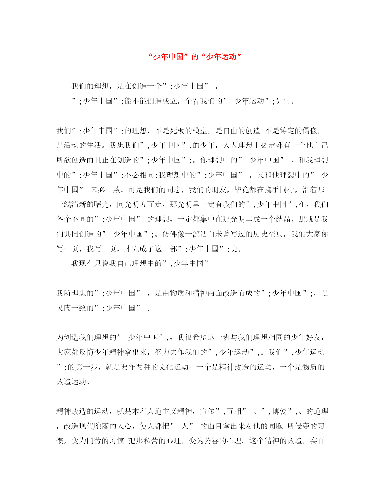 此资料由网络收集而来,如有侵权请告知上传者立即删除。资料共分享,我们负责传递知识。“少年中国”的“少年运动”我们的理想,是在创造一个”;少年中国”;。”;少年中国”;能不能创造成立,全看我们的”;少年运动”;如何。我们”;少年中国”;的理想,不是死板的模型,是自由的创造;不是铸定的偶像,是活动的生活。我想我们”;少年中国”;的少年,人人理想中必定都有一个他自己所欲创造而且正在创造的”;少年中国”;。你理想中的”;少年中国”;,和我理想中的”;少年中国”;不必相同;我理想中的”;少年中国”;,又和他理想中的