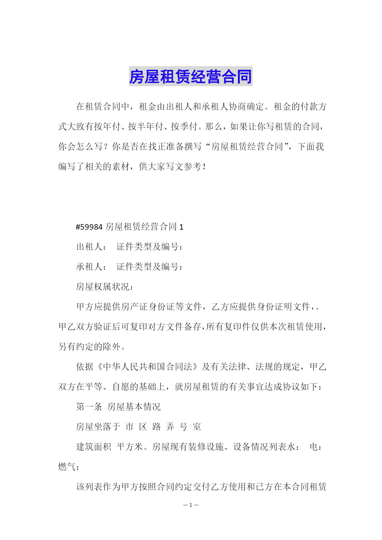 —PAGE\*MERGEFORMAT10—房屋租赁经营合同在租赁合同中,租金由出租人和承租人协商确定。租金的付款方式大致有按年付、按半年付、按季付。那么,如果让你写租赁的合同,你会怎么写?你是否在找正准备撰写“房屋租赁经营合同”,下面我编写了相关的素材,供大家写文参考!#59984房屋租赁经营合同1出租人:证件类型及编号:承租人:证件类型及编号:房屋权属状况:甲方应提供房产证身份证等文件,乙方应提供身份证明文件,。甲乙双方验证后可复印对方文件备存,所有复印件仅供本次租赁使用,另有约定的除外。依据《中