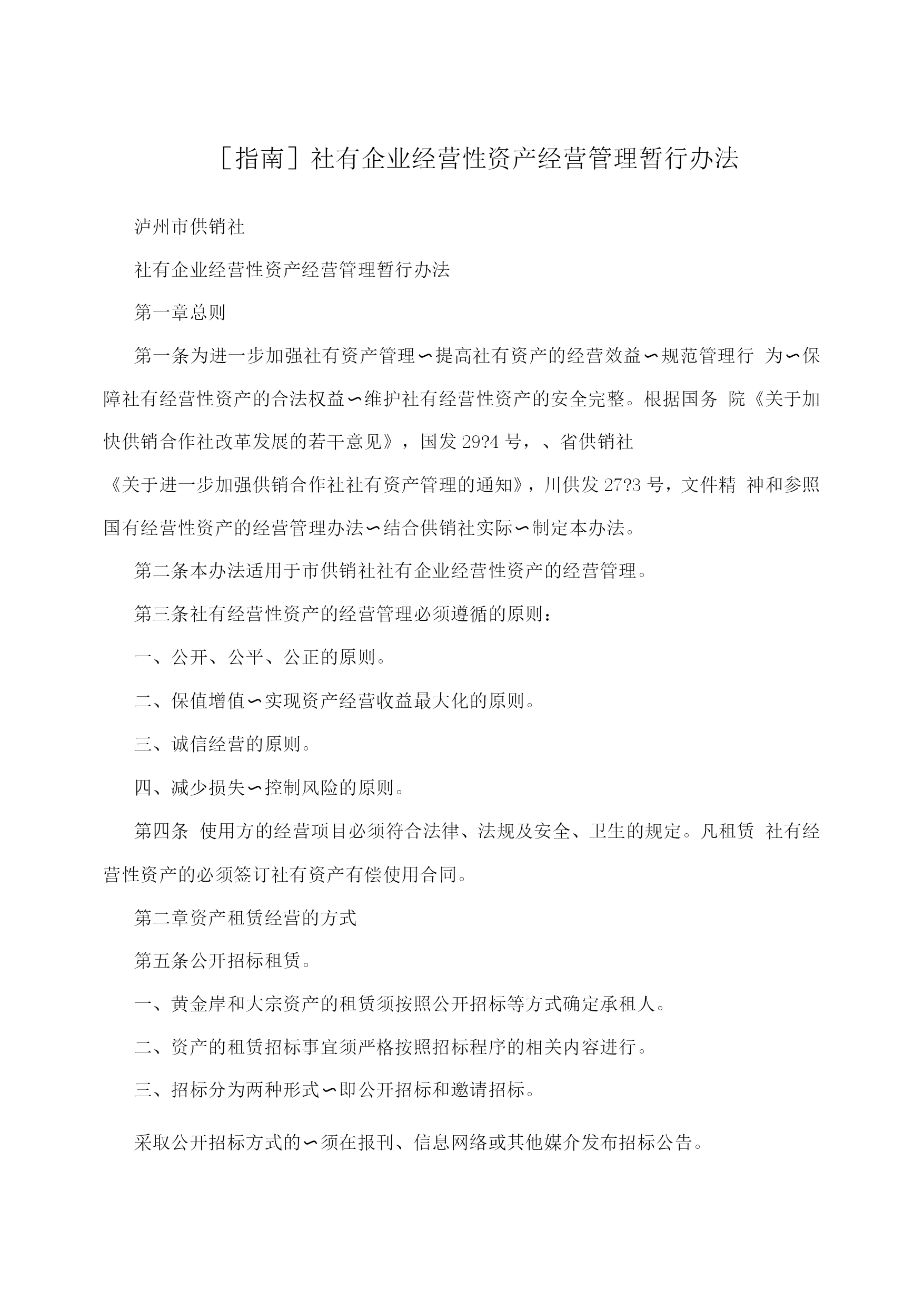 [指南]社有企业经营性资产经营管理暂行办法泸州市供销社社有企业经营性资产经营管理暂行办法第一章总则第一条为进一步加强社有资产管理〜提高社有资产的经营效益〜规范管理行为〜保障社有经营性资产的合法权益〜维护社有经营性资产的安全完整。根据国务院《关于加快供销合作社改革发展的若干意见》,国发29?4号,、省供销社《关于进一步加强供销合作社社有资产管理的通知》,川供发27?3号,文件精神和参照国有经营性资产的经营管理办法〜结合供销社实际〜制定本办法。第二条本办法适用于市供销社社有企业经营性资产的经营管理。第三条社有