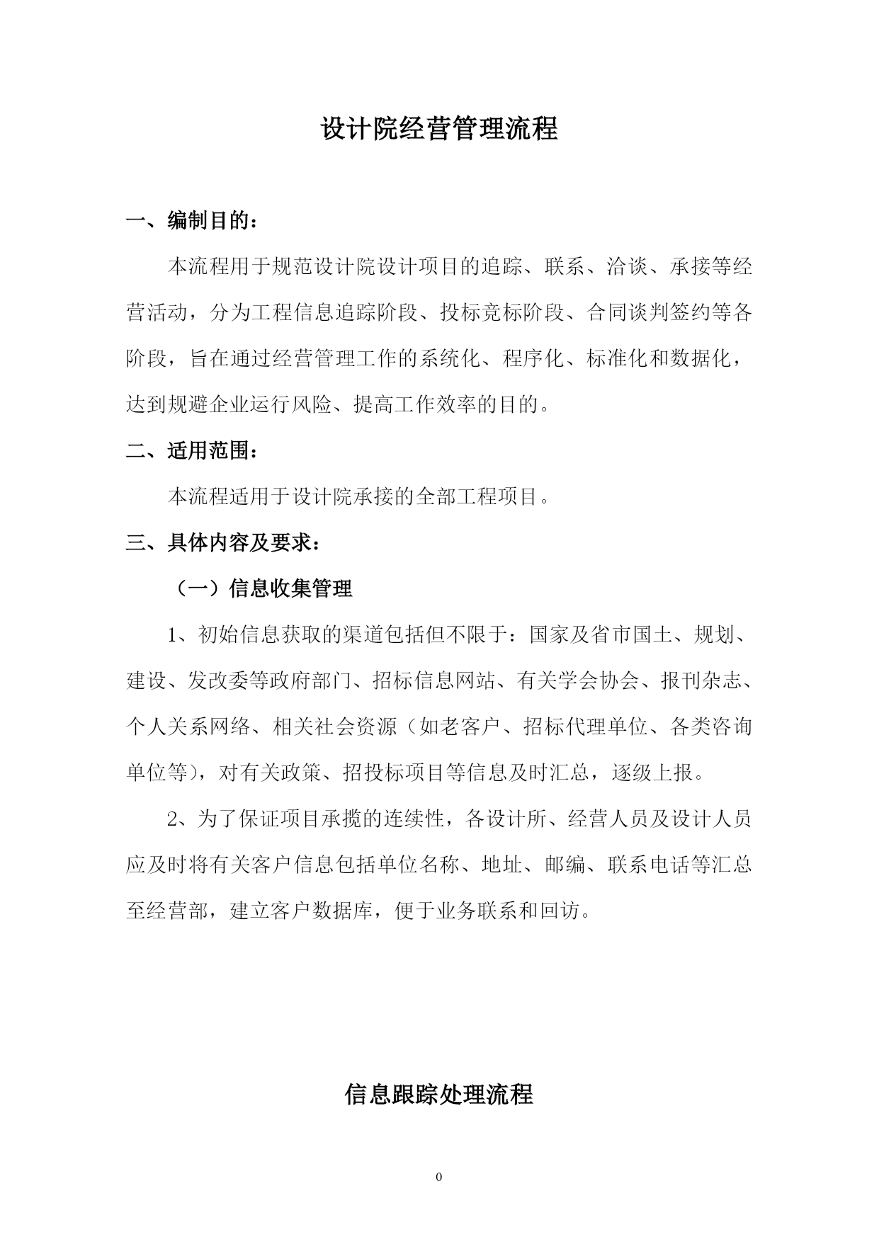 PAGE4设计院经营管理流程一、编制目的:本流程用于规范设计院设计项目的追踪、联系、洽谈、承接等经营活动,分为工程信息追踪阶段、投标竞标阶段、合同谈判签约等各阶段,旨在通过经营管理工作的系统化、程序化、标准化和数据化,达到规避企业运行风险、提高工作效率的目的。二、适用范围:本流程适用于设计院承接的全部工程项目。具体内容及要求:(一)信息收集管理1、初始信息获取的渠道包括但不限于:国家及省市国土、规划、建设、发改委等政府部门、招标信息网站、有关学会协会、报刊杂志、个人关系网络、相关社会资源(如老客户、