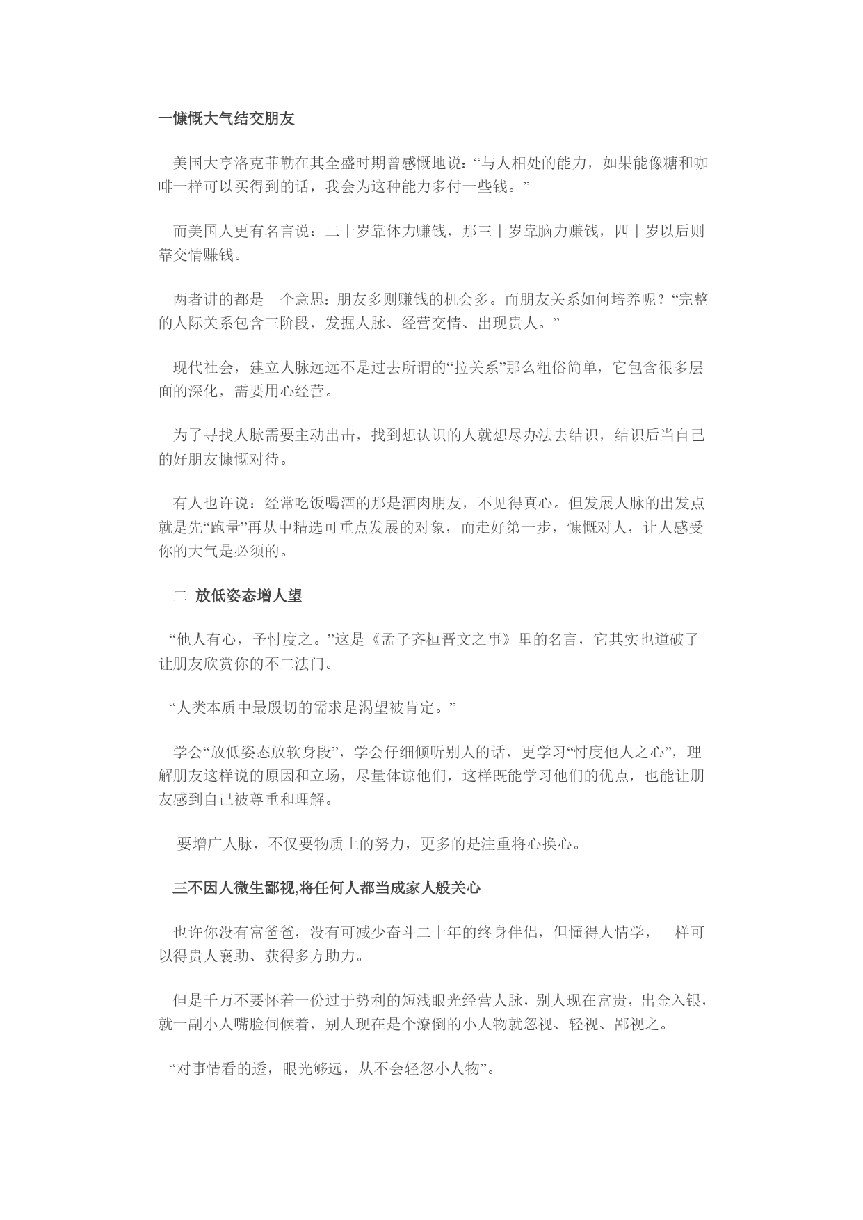一慷慨大气结交朋友美国大亨洛克菲勒在其全盛时期曾感慨地说:“与人相处的能力,如果能像糖和咖啡一样可以买得到的话,我会为这种能力多付一些钱。”而美国人更有名言说:二十岁靠体力赚钱,那三十岁靠脑力赚钱,四十岁以后则靠交情赚钱。两者讲的都是一个意思:朋友多则赚钱的机会多。而朋友关系如何培养呢?“完整的人际关系包含三阶段,发掘人脉、经营交情、出现贵人。”现代社会,建立人脉远远不是过去所谓的“拉关系”那么粗俗简单,它包含很多层面的深化,需要用心经营。为了寻找人脉需要主动出击,找到想认识的人就想尽办法去结识,结识后当