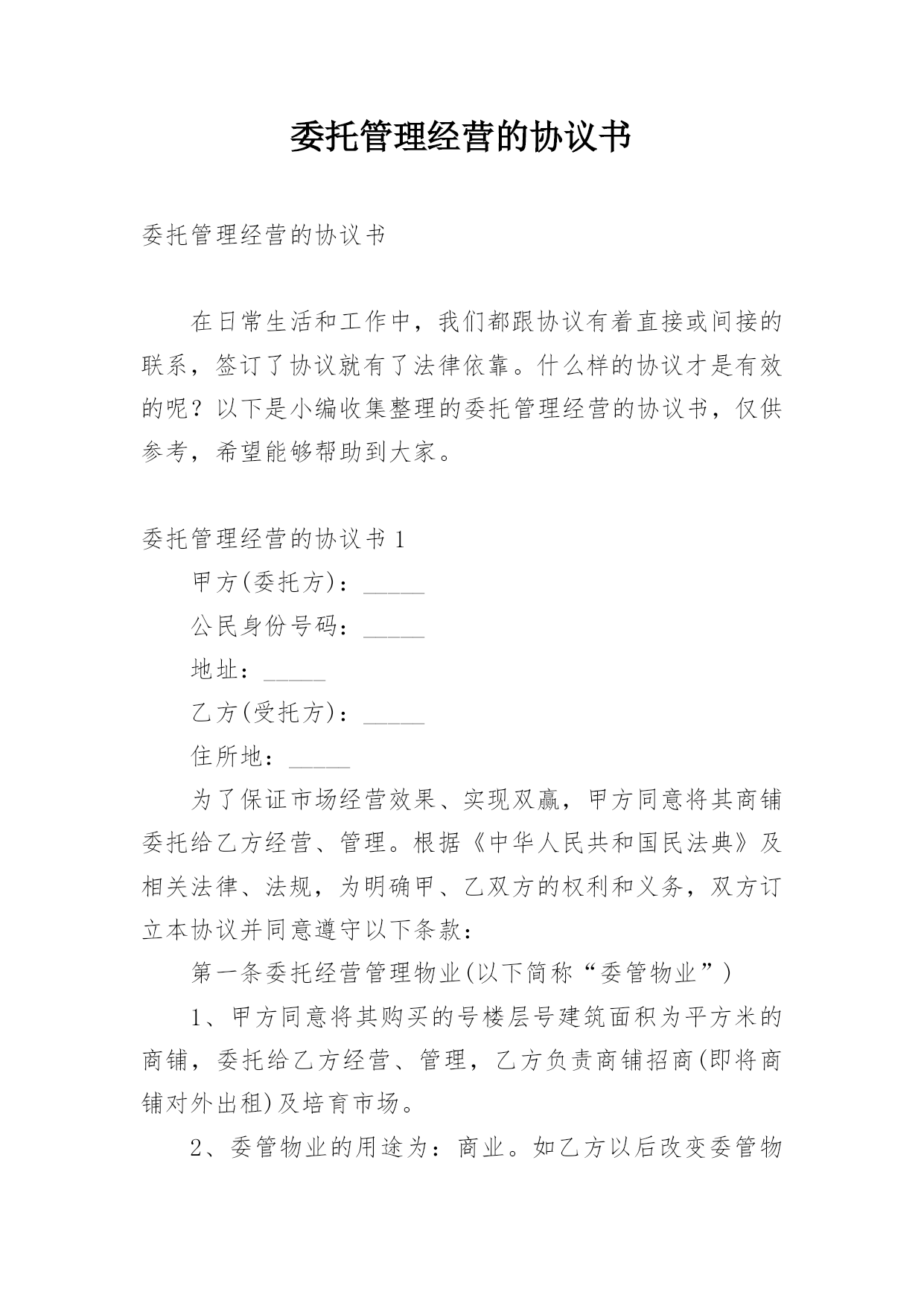 委托管理经营的协议书委托管理经营的协议书在日常生活和工作中,我们都跟协议有着直接或间接的联系,签订了协议就有了法律依靠。什么样的协议才是有效的呢?以下是小编收集整理的委托管理经营的协议书,仅供参考,希望能够帮助到大家。委托管理经营的协议书1甲方(委托方):_____公民身份号码:_____地址:_____乙方(受托方):_____住所地:_____为了保证市场经营效果、实现双赢,甲方同意将其商铺委托给乙方经营、管理。根据《中华人民共和国民法典》及相关法律、法规,为明确甲、乙双方的权利和义务,双方订立本协议
