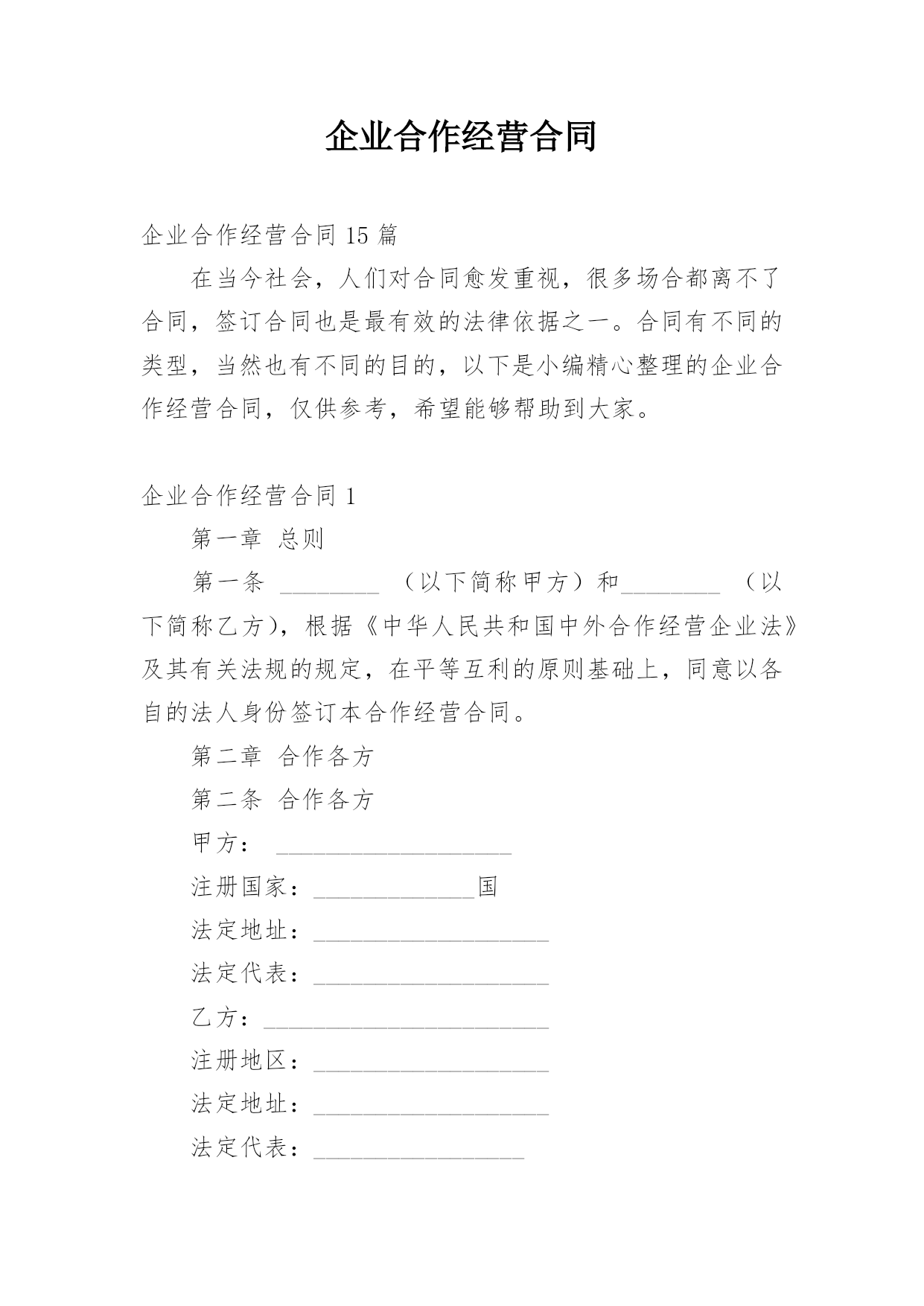 企业合作经营合同企业合作经营合同15篇在当今社会,人们对合同愈发重视,很多场合都离不了合同,签订合同也是最有效的法律依据之一。合同有不同的类型,当然也有不同的目的,以下是小编精心整理的企业合作经营合同,仅供参考,希望能够帮助到大家。企业合作经营合同1第一章总则第一条________(以下简称甲方)和________(以下简称乙方),根据《中华人民共和国中外合作经营企业法》及其有关法规的规定,在平等互利的原则基础上,同意以各自的法人身份签订本合作经营合同。第二章合作各方第二条合作各方甲方:_________