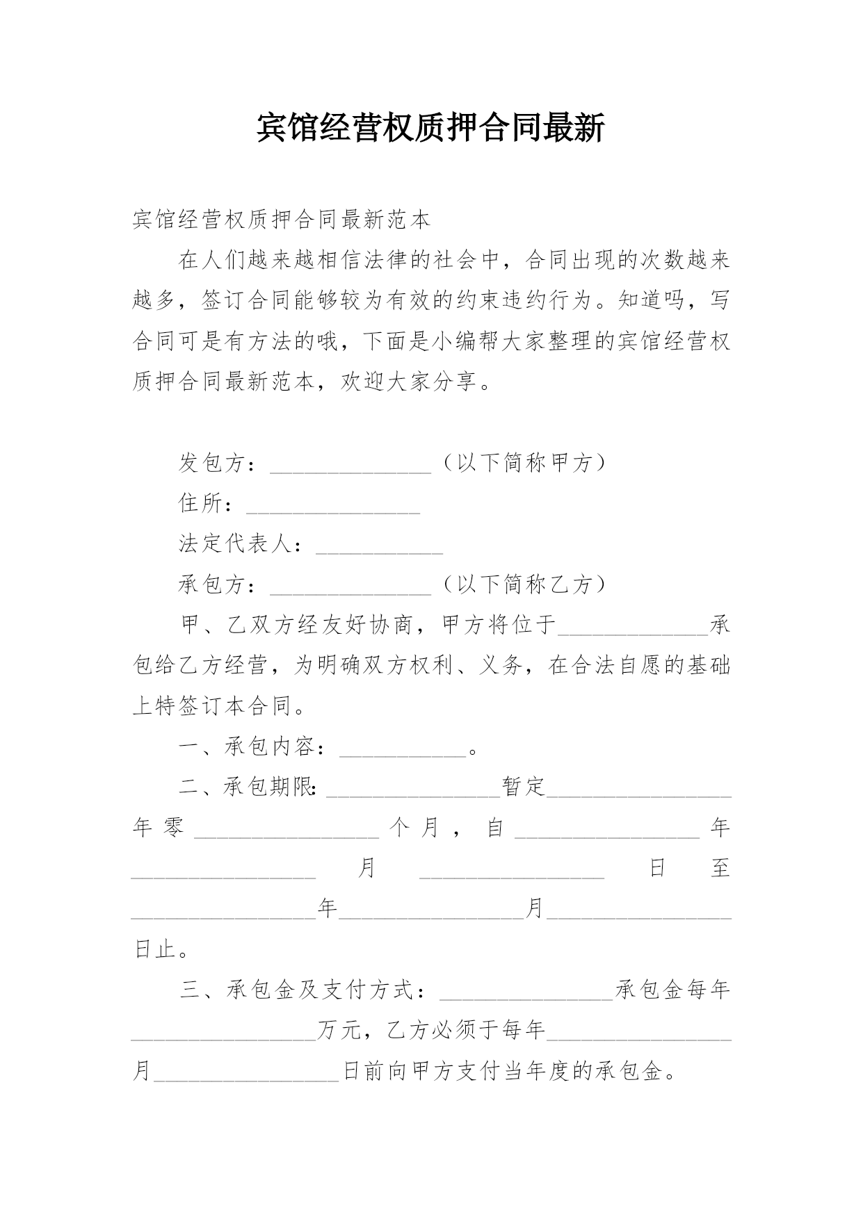 宾馆经营权质押合同最新宾馆经营权质押合同最新范本在人们越来越相信法律的社会中,合同出现的次数越来越多,签订合同能够较为有效的约束违约行为。知道吗,写合同可是有方法的哦,下面是小编帮大家整理的宾馆经营权质押合同最新范本,欢迎大家分享。发包方:______________(以下简称甲方)住所:_______________法定代表人:___________承包方:______________(以下简称乙方)甲、乙双方经友好协商,甲方将位于_____________承包给乙方经营,为明确双方权利、义务,在合法自