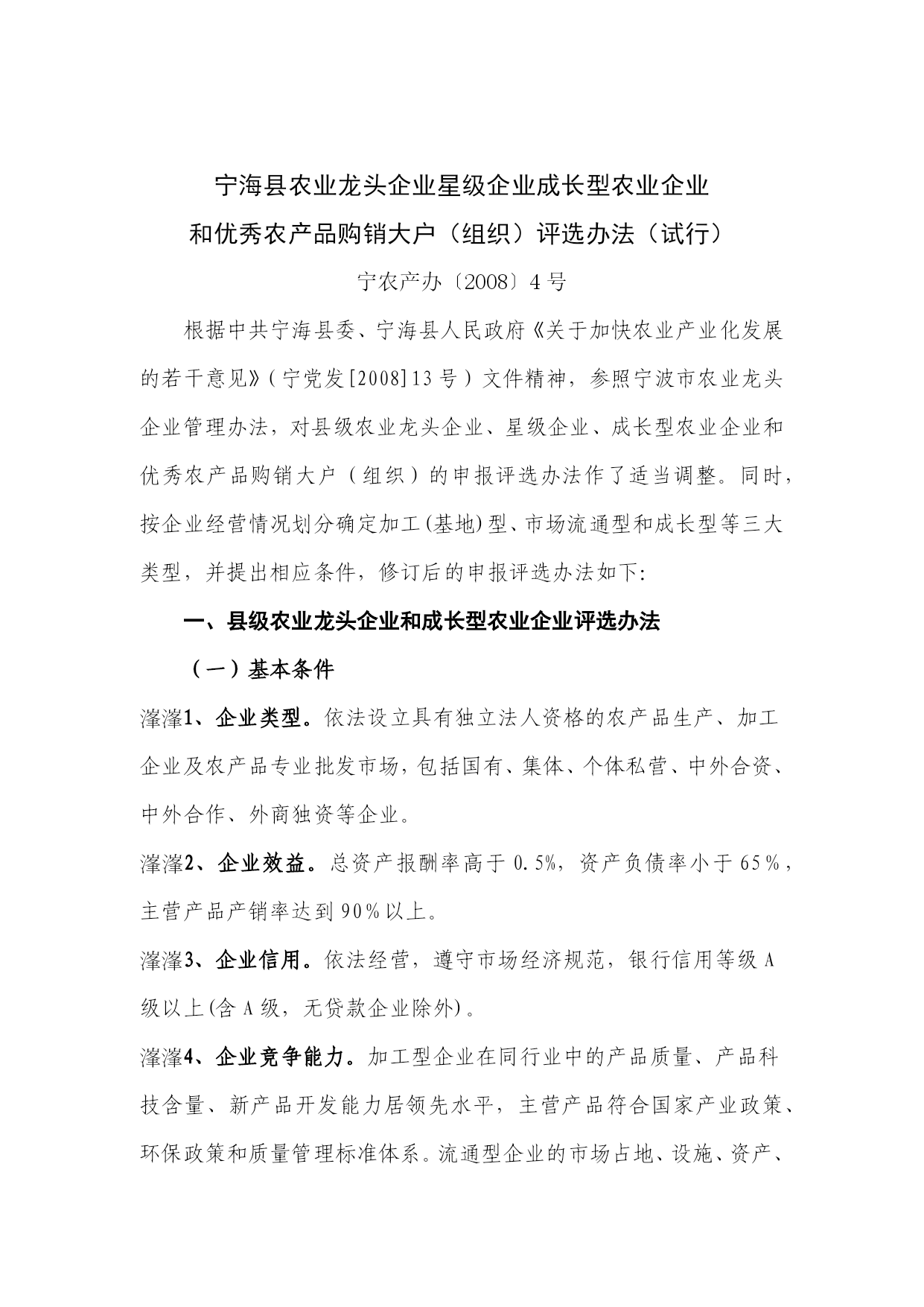 编号:时间:2021年x月x日书山有路勤为径,学海无涯苦作舟页码:第PAGE24页共NUMPAGES24页第PAGE\*MERGEFORMAT24页共NUMPAGES\*MERGEFORMAT24页宁海县农业龙头企业星级企业成长型农业企业和优秀农产品购销大户(组织)评选办法(试行)宁农产办〔2008〕4号根据中共宁海县委、宁海县人民政府《关于加快农业产业化发展的若干意见》(宁党发[2008]13号)文件精神,参照宁波市农业龙头企业管理办法,对县级农业龙头企业、星级企业、成长型农业企